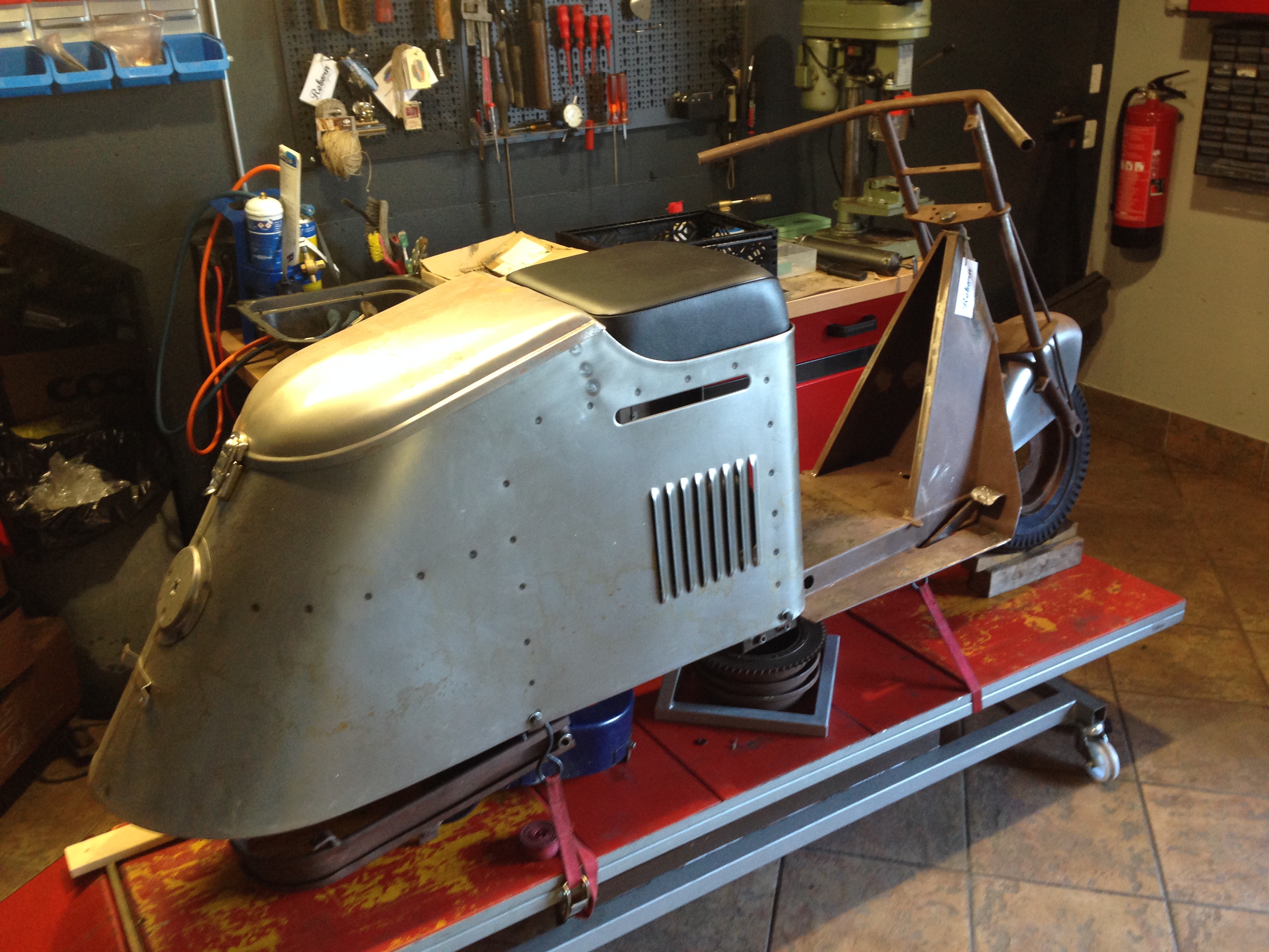 Refabrication de la lunette arrière mise en peinture du fond de cabine et des montants puis pose de l'ensemble sur le triporteur.