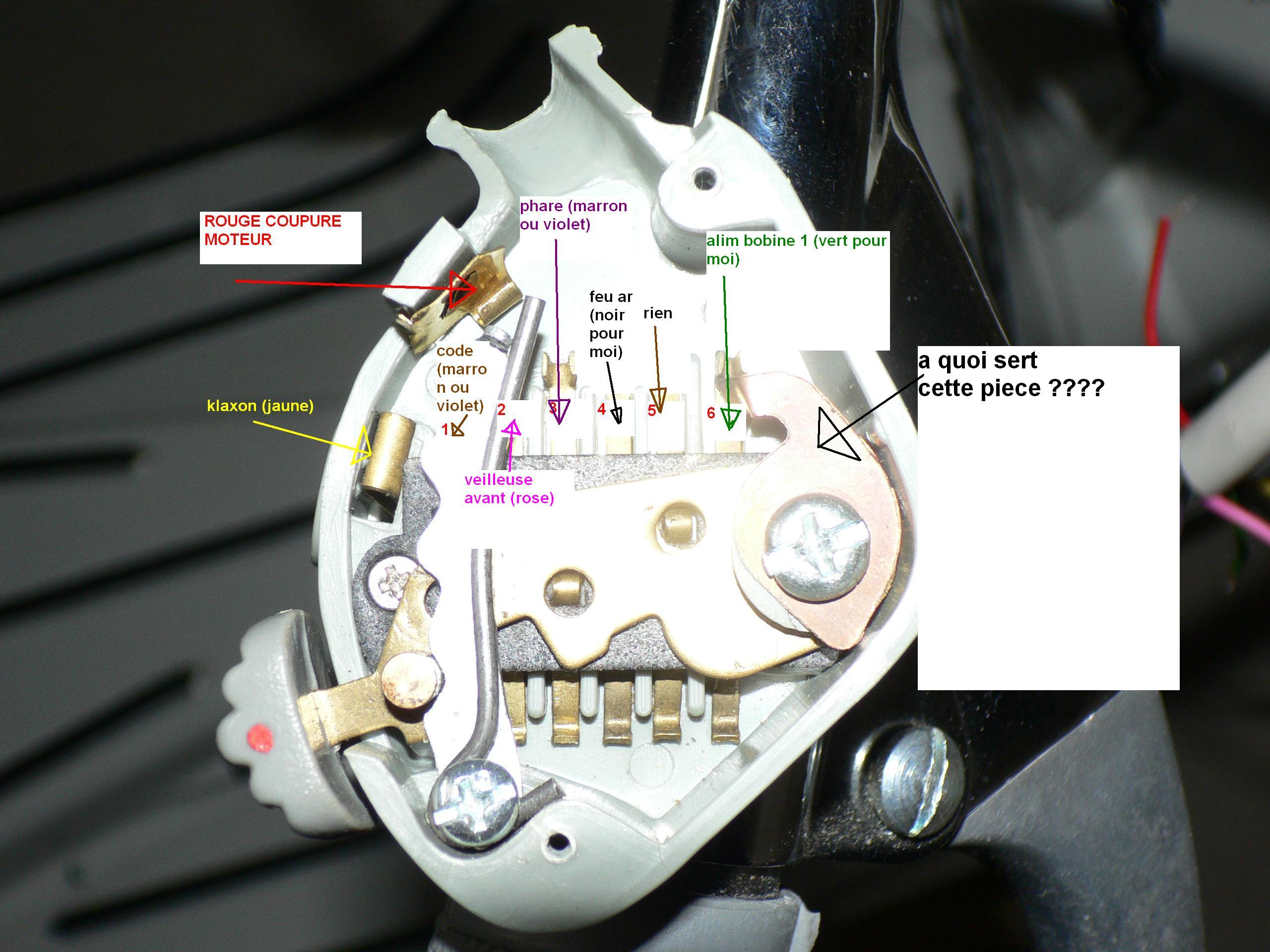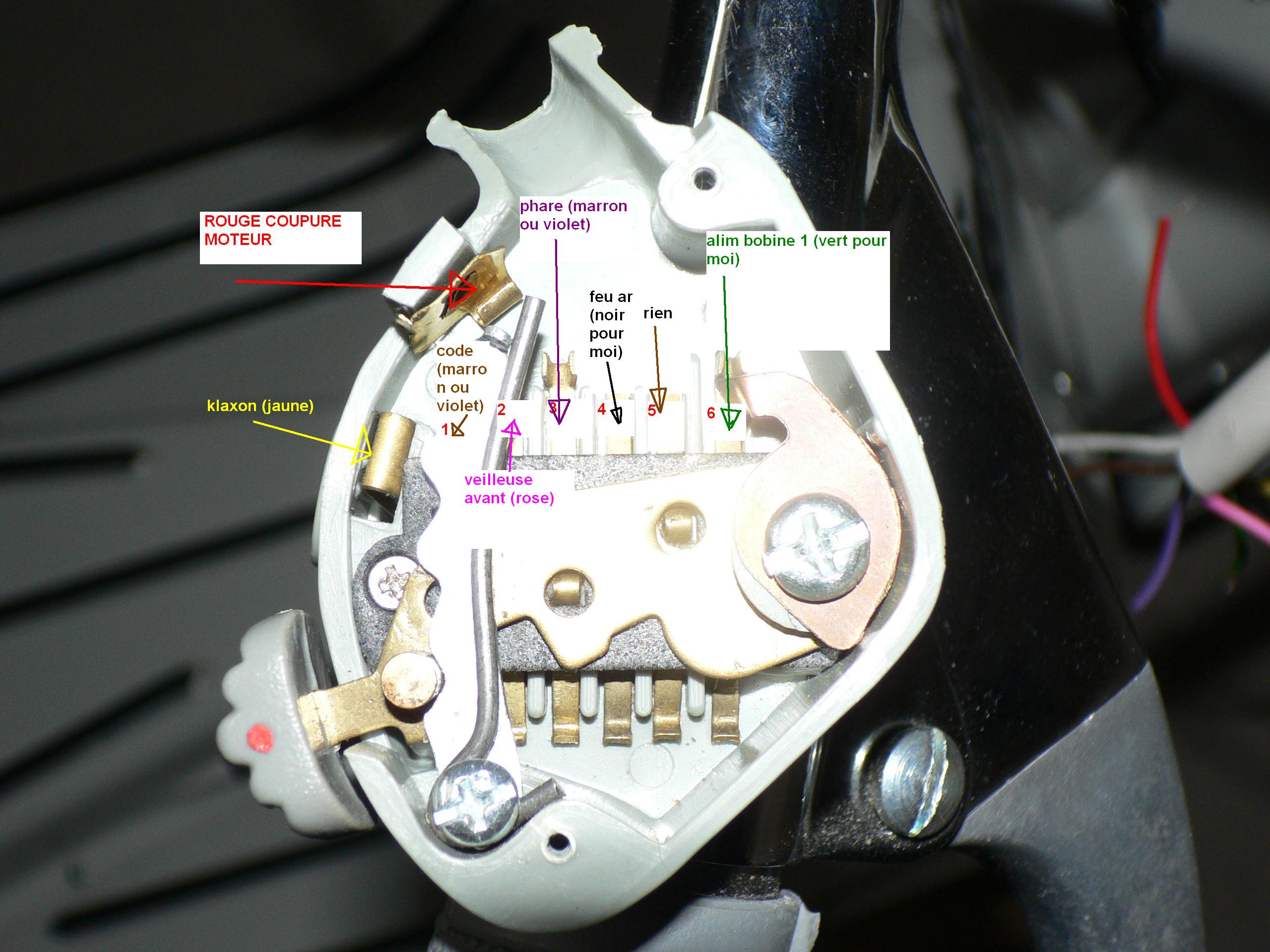 j'ai câblé le phare, le feu ar, le klaxon, mais je sèche sur les connexions ai niveau du commutateur