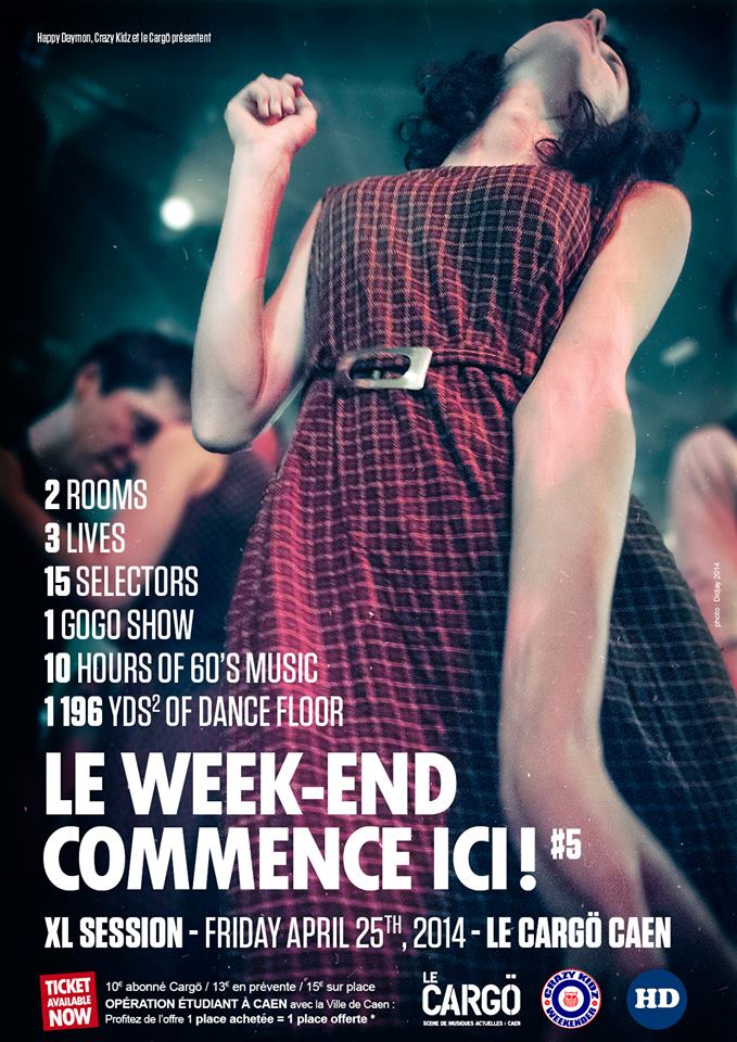 Depuis 4 ans, Happy Daymon et Crazy Kidz se retroussent les manches pour transformer le Cargö en brit club des glorieuses 60’s et embarquer 700 all nighters dans une nuit de danses effrénées, vinyles obligés, dresscode apprécié, élégance affichée. Chaque année, à l’heure où le brouillard matinal normand n’a rien à envier au fog londonien, le public de nous dire : encore ! alors, cette fois, ce sera double ration pour tout le monde : 15 dJs, 3 lives, 1 gogo show, 2 salles, 1 000m² de dancefloor, pour 10 heures du meilleur de la musique sixties, soul, mod, rytm’n blues boogaloo, ska, garage, freakbeat... ready ? steady ? go !