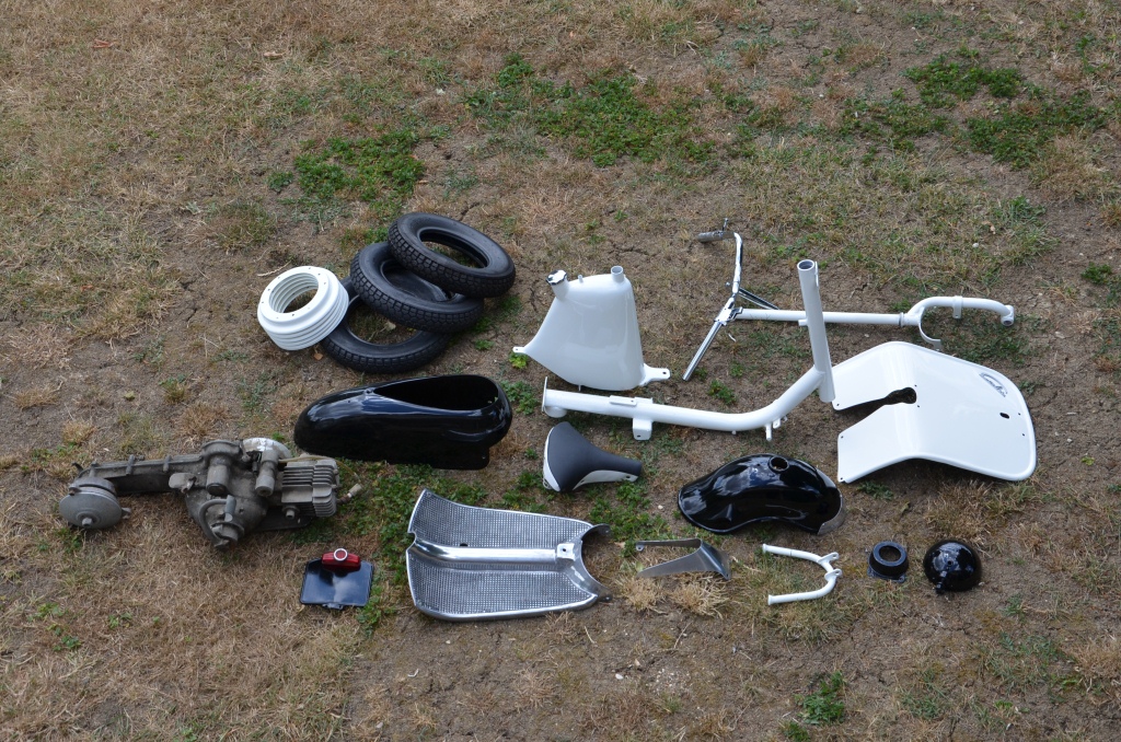 Voilà à ce jour l'état de la bébête, je commence à assembler. Suite des images au fur et à mesure. Hâte de faire le crapaud sur ce scooter, et j'imagine le grand Tonton dessus !