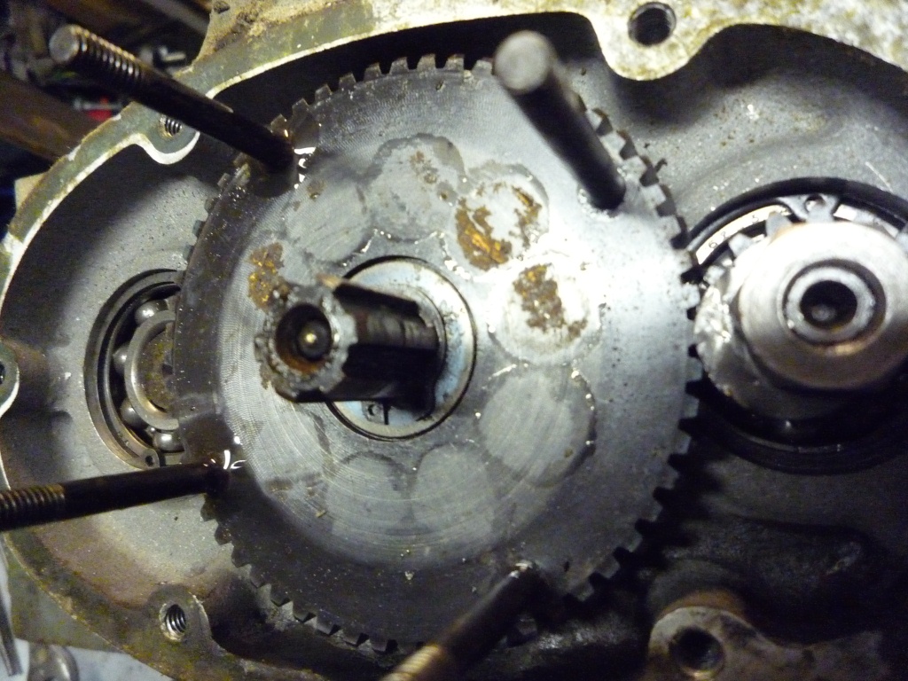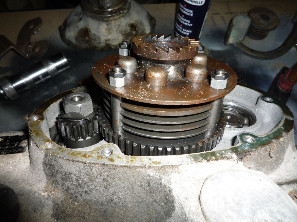 Il est complètement différent du Guépar, avec un embrayage spectaculaire, et une ^boîte de vitesses (2) avec une jolie fourchette en bronze. Presque tout démonté pour aller ensuite au microbillage. L'intérieur semble ne pas avoir tourné beaucoup, le principal c'est de changer les spis.