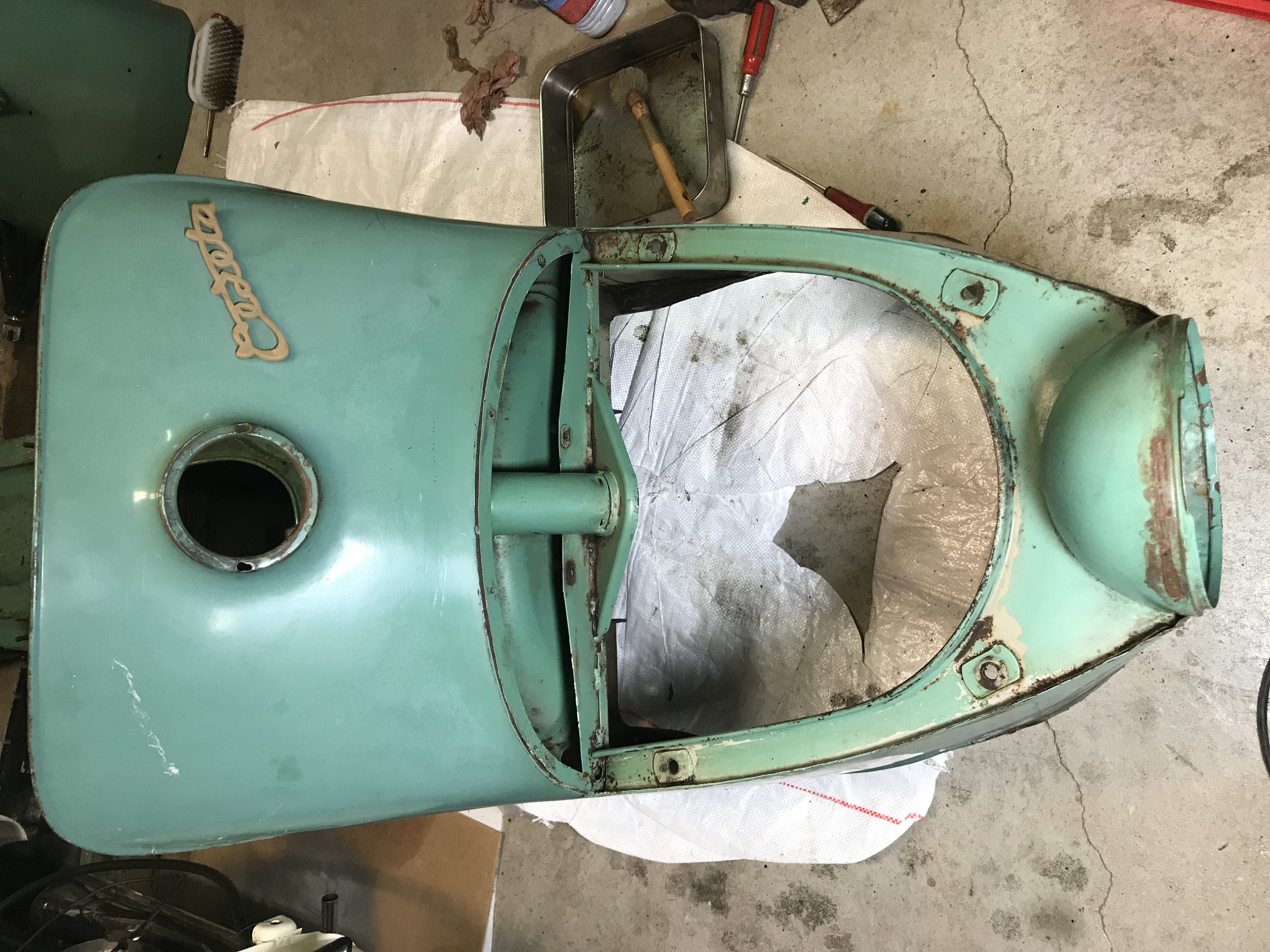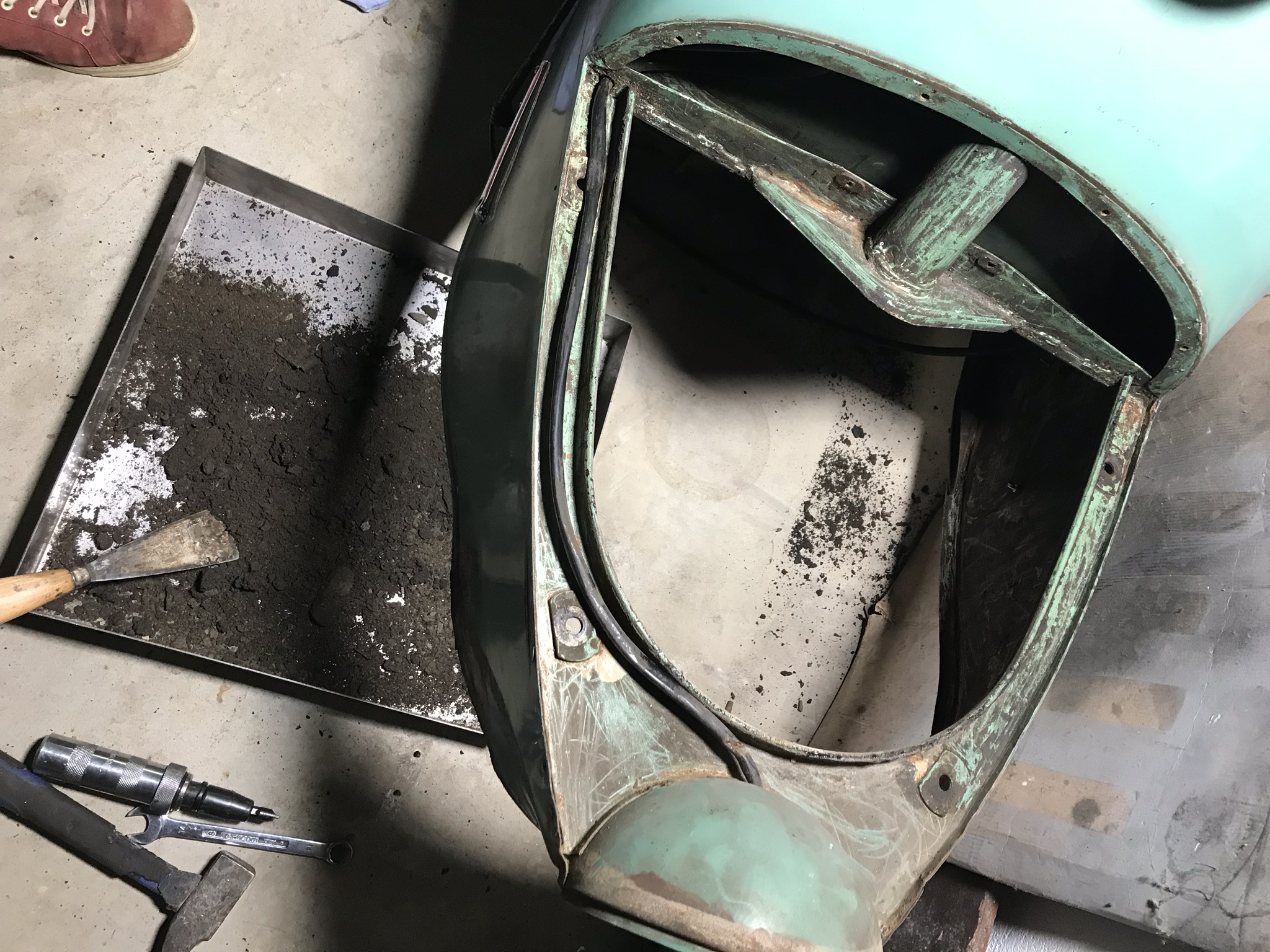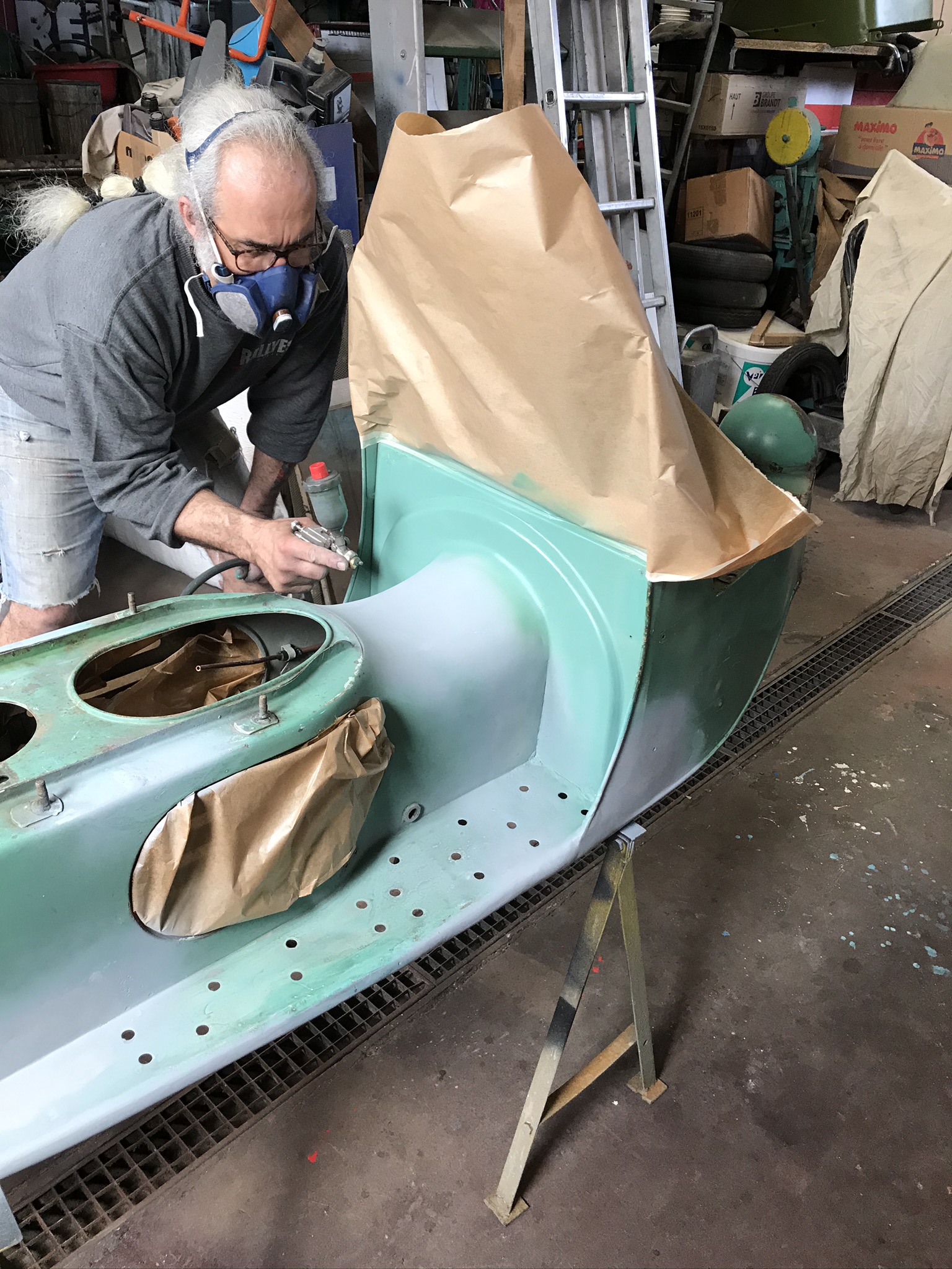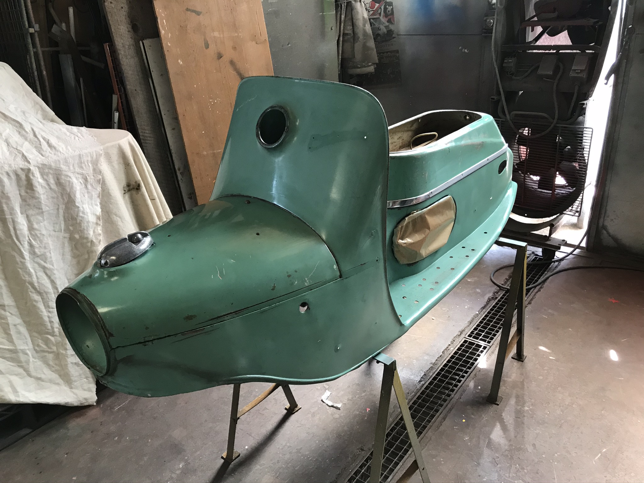 Hier, une matinée chez l’ami Jean Do pour une séance peinture. La coque du Cezeta avait pris cher dans sa première vie tchèque, et la finesse de travail des réparateurs devait être à la hauteur du cadre de vie.....! Des grosses soudures à l’arc très apparentes, du sinto généreux et de la peinture verte, oui, mais pas la bonne. Alors j’avais meulé, ressoudé, enduit, pour retrouver des formes lisses, tout en conservant tout ce qui fait la vie passée du scooter. Comme je veux garder toute sa patine de sa peinture d’origine, il faut de la parcimonie