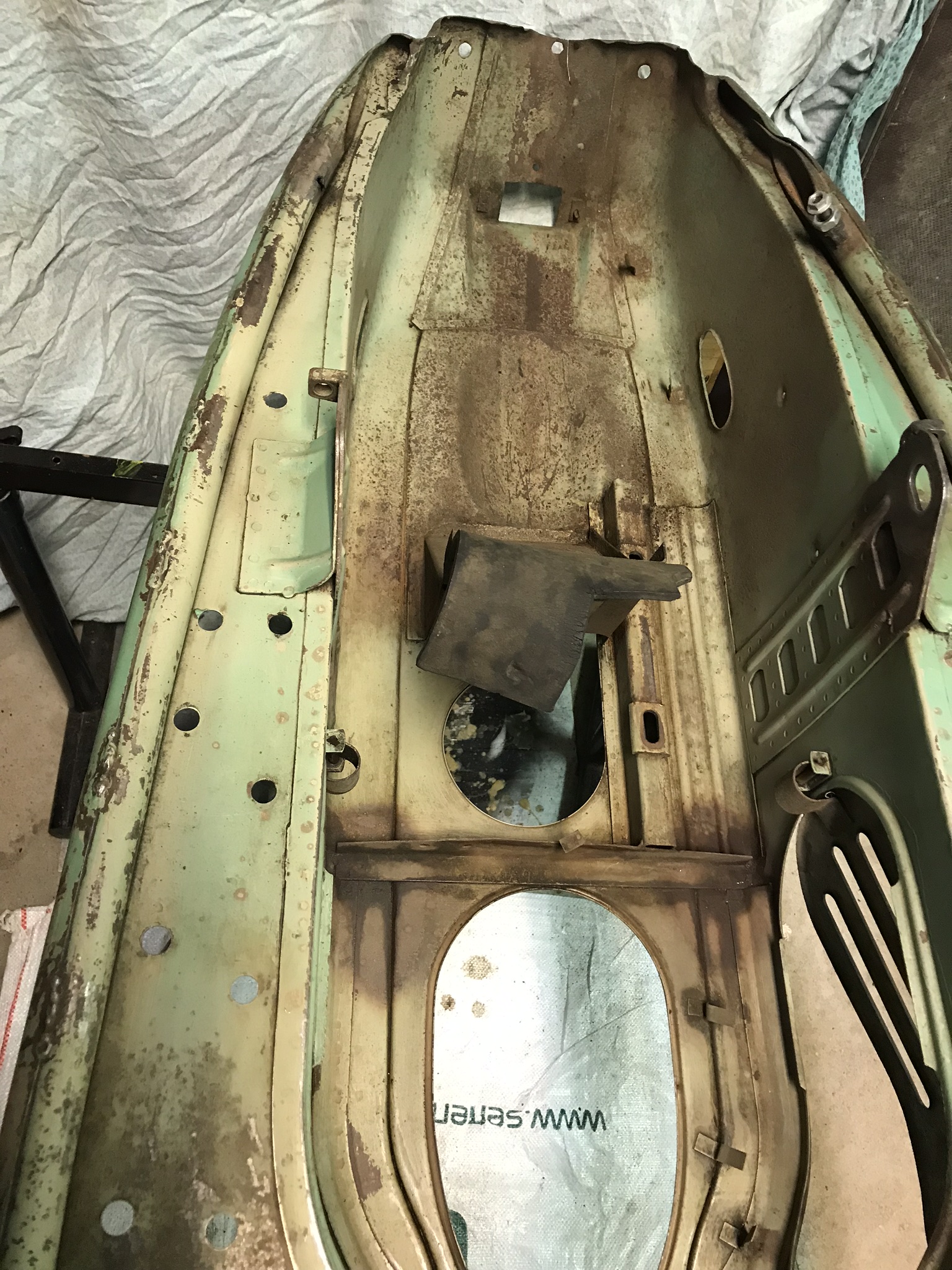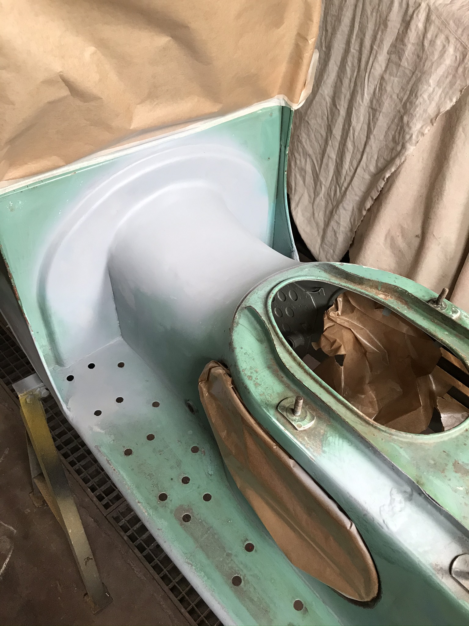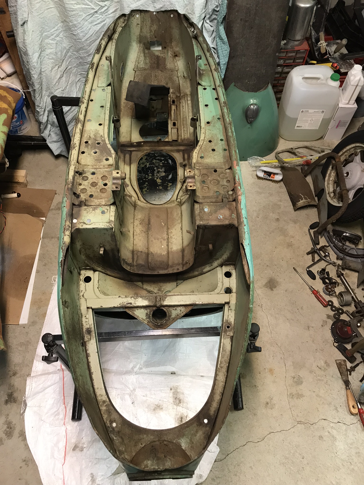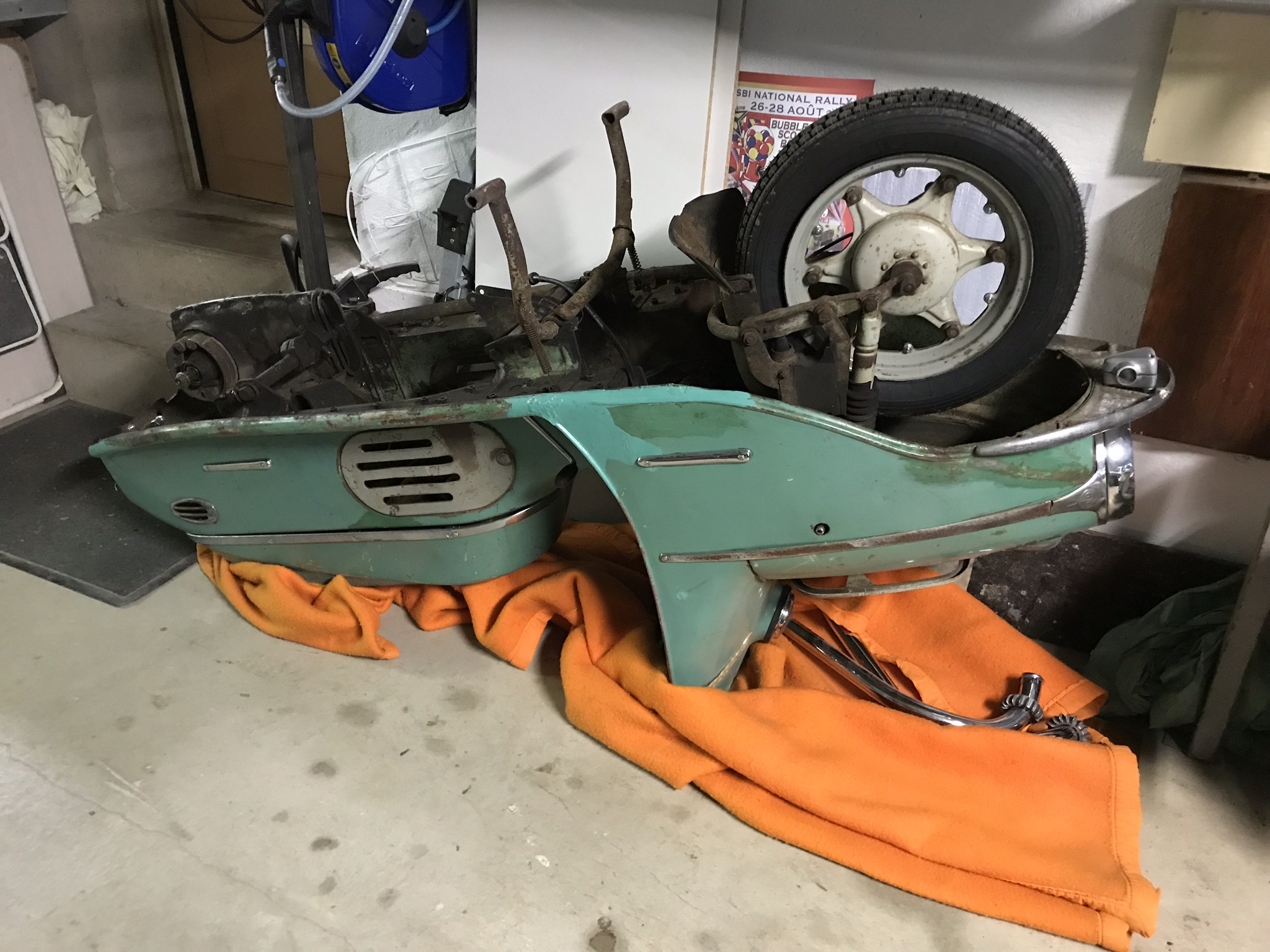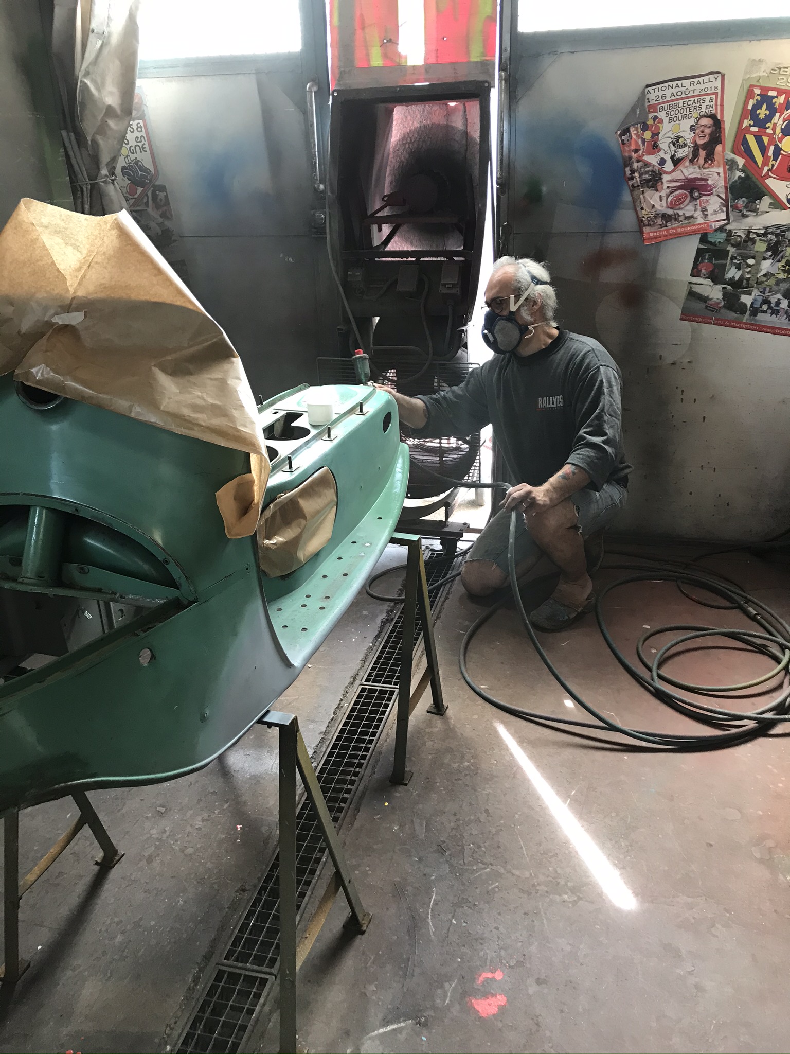 Hier, une matinée chez l’ami Jean Do pour une séance peinture. La coque du Cezeta avait pris cher dans sa première vie tchèque, et la finesse de travail des réparateurs devait être à la hauteur du cadre de vie.....! Des grosses soudures à l’arc très apparentes, du sinto généreux et de la peinture verte, oui, mais pas la bonne. Alors j’avais meulé, ressoudé, enduit, pour retrouver des formes lisses, tout en conservant tout ce qui fait la vie passée du scooter. Comme je veux garder toute sa patine de sa peinture d’origine, il faut de la parcimonie