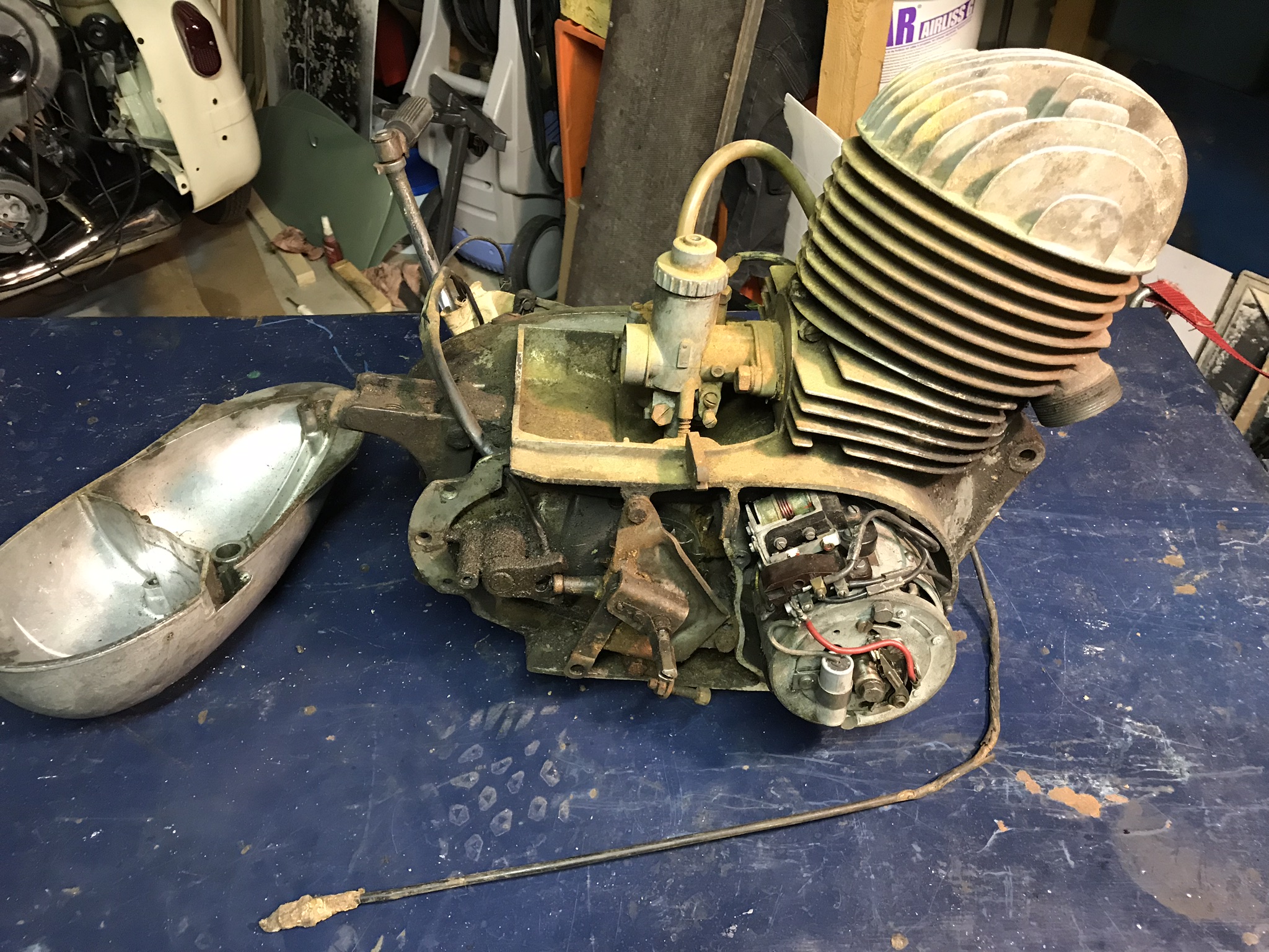 Suite du déshabillage, je peux facilement identifier que le Cezeta roulait dans une région avec du sable! Les paquets de cambouis croustillent! La fourche est démontée, les billes étaient toutes sèches , les pièces commandées arrivent au fur et à mesure. Au programme maintenant, un bon lavage de l’intérieur de la coque avant de remettre une peinture de protection, changement de la bielle et son maneton, réalésage pour le nouveau piston, microbillage des carters, et ensuite on va envisager le début du remontage moteur