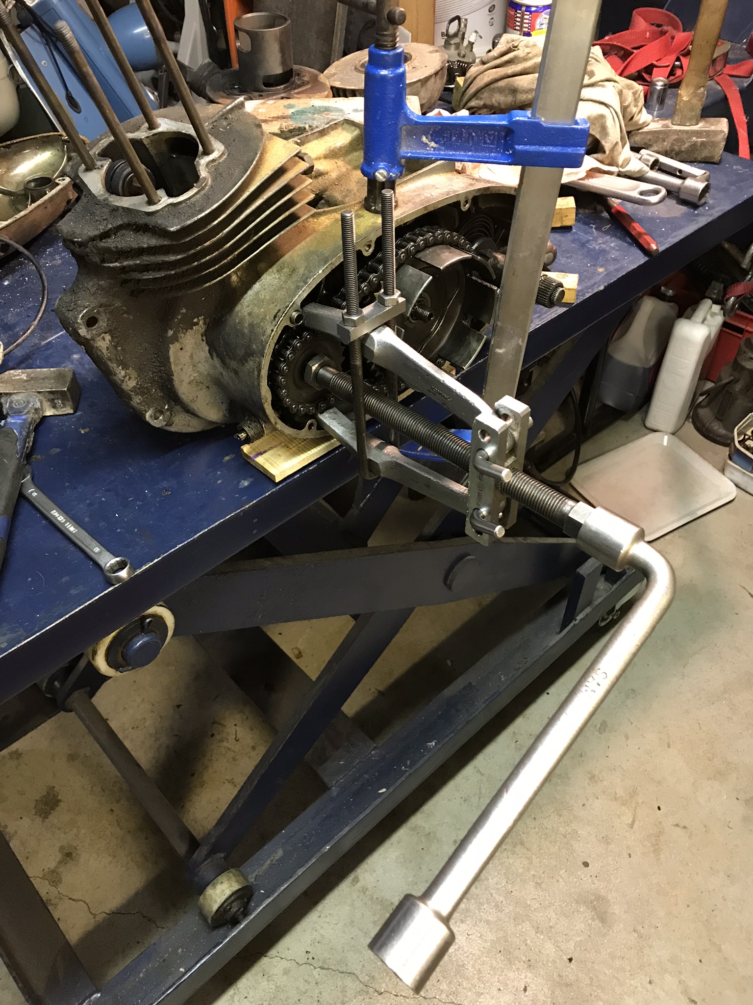Suite du démontage, les tchèques font dans le solide! Impressionnant la taille et poids de l’embiellage, le Bernie 250 me paraissait gros, mais là, respect! Avec les bons conseils de Raid, la dynamo est sortie tranquillement, par contre le pignon de la primaire, complètement collé sur son cône, arrache flambard et bonne tension pour y arriver. C’est de la belle mécanique, on le voit faite pour durer, et fiable