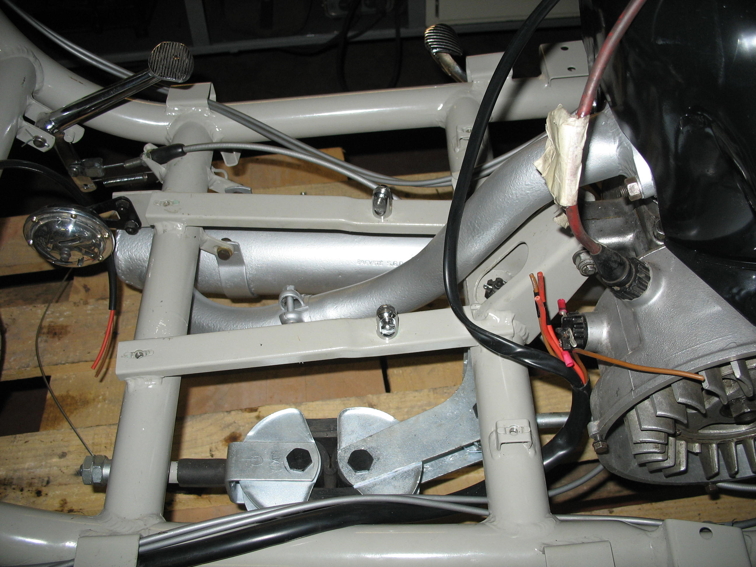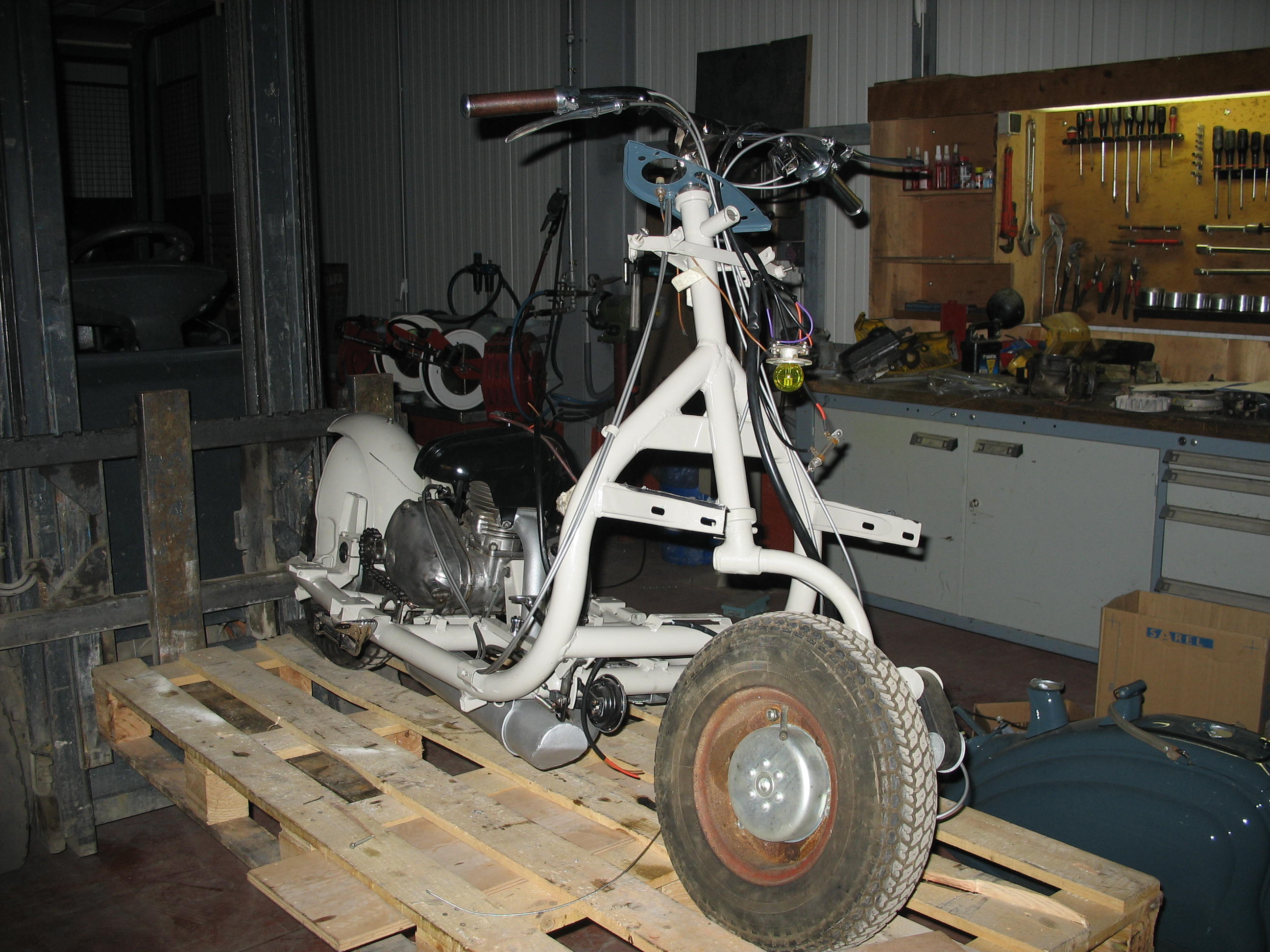 salut je pense que ton balancier n'est pas assez quillé signe que les anneaux ne sont pas assez en tension inconvénient sur route dégradée ça secoue grave avec lors des freinages la roue qui risque de frotter le gb sur les photos d'époque le balancier est pratiquement a la verticale aprés c'est dommage de ne pas avoir mis du souplisseau gris sur les 2 cables de vitesses avec un manchon type vespa en sortie de poignée tournante ceux des lambretta ld modéle italien y vont parfaitement sinon pour les reste félicitation super boulot