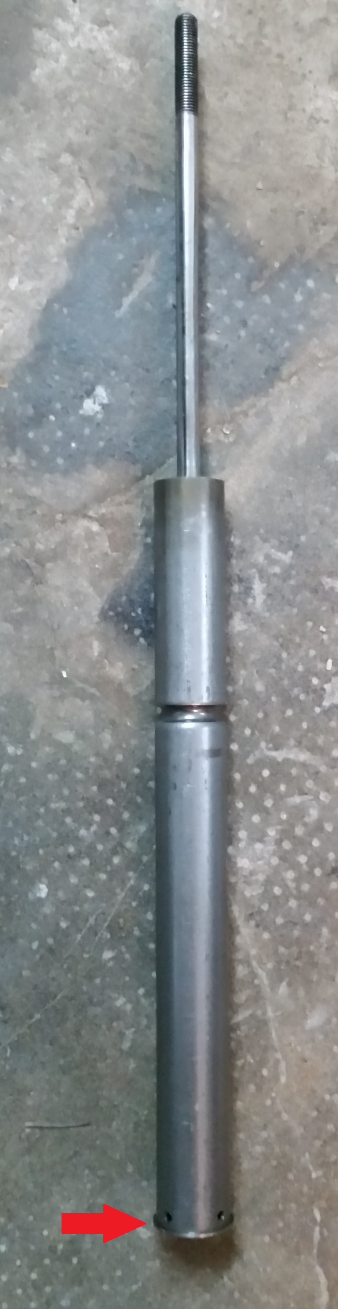 J'ai démonté mon amortisseur arrière sur un vespa 150 de 1957 et j'aimerais savoir si la partie inférieure se démonte face à la flèche rouge sur la photo ci-dessous...j'ai l'impression que oui mais je ne sais pas comment...est-ce que c'est vissé ? Pas normal ou inversé ? Je veux pas marquer