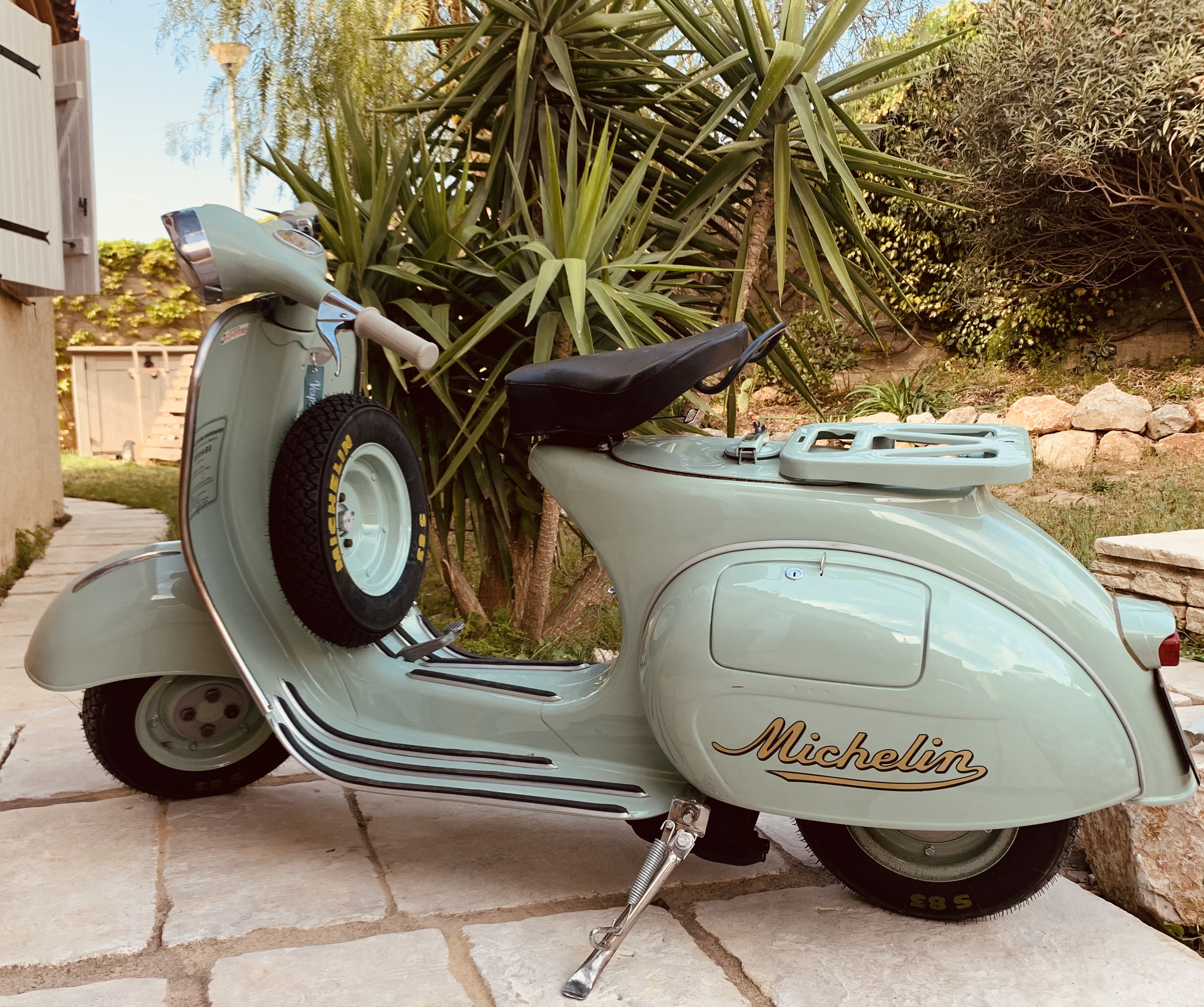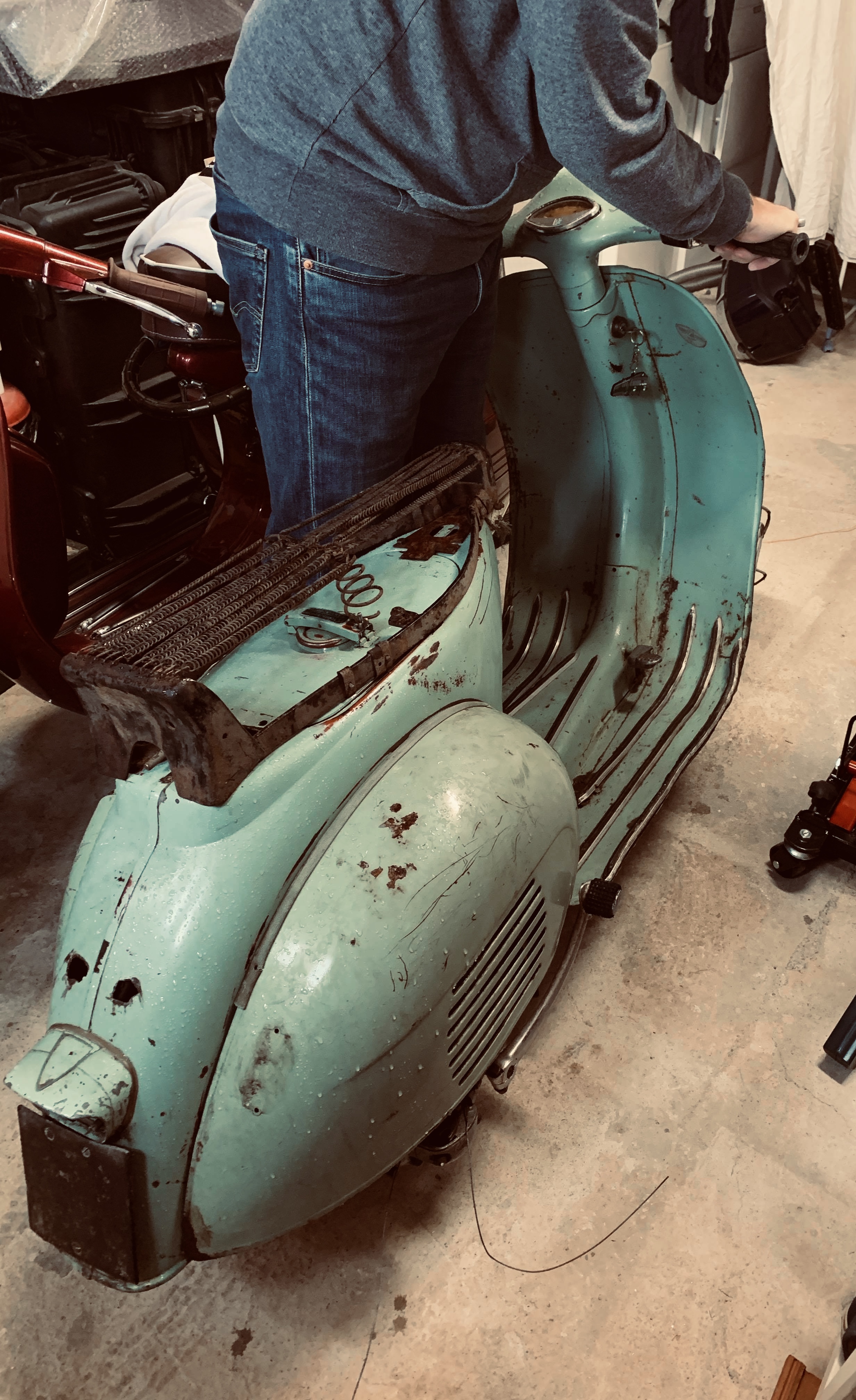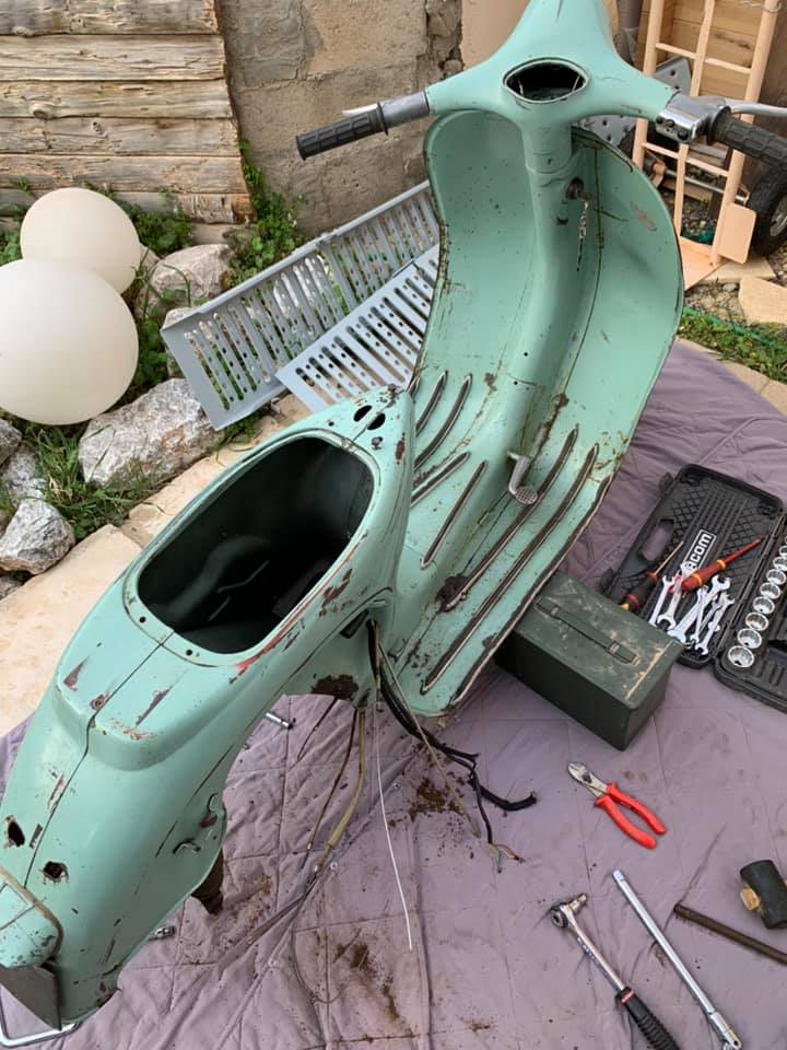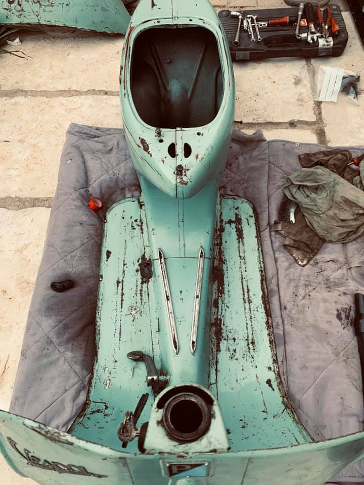 Salut, dans les 2 cas l'écusson est en alu. Riveté en 59, collé à partir de 60 (en observant bien le mien est collé de travers sur la gauche:mrgreen: scoot dans son jus). Tu pourras pas l'enlever sans l'abîmer, soit tu gardes le tien et peinture sinon une repro qui n'existe pas il me semble sans l'inscription piaggio, donc en partie à repeindre.