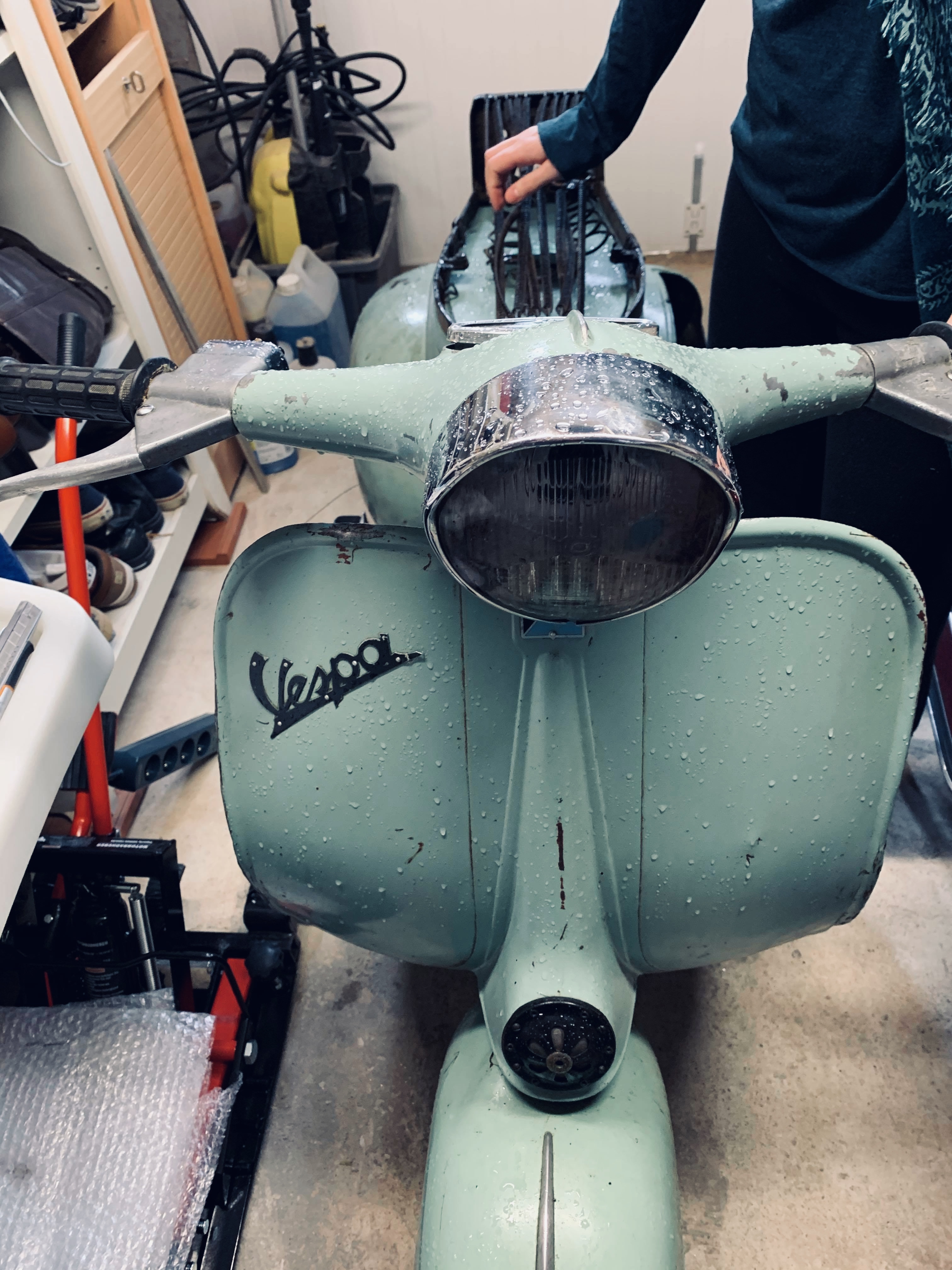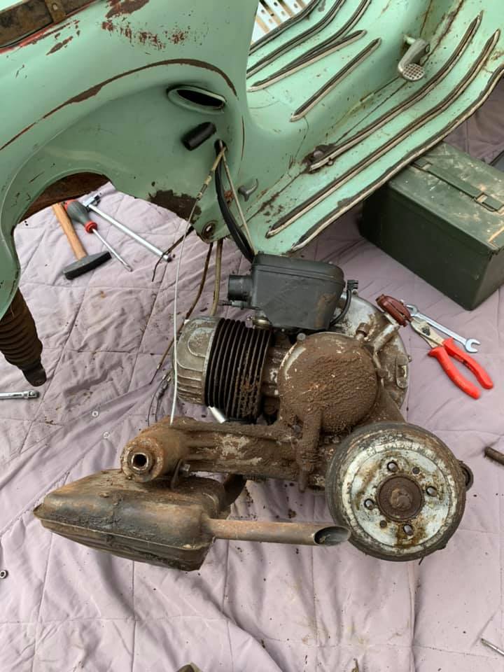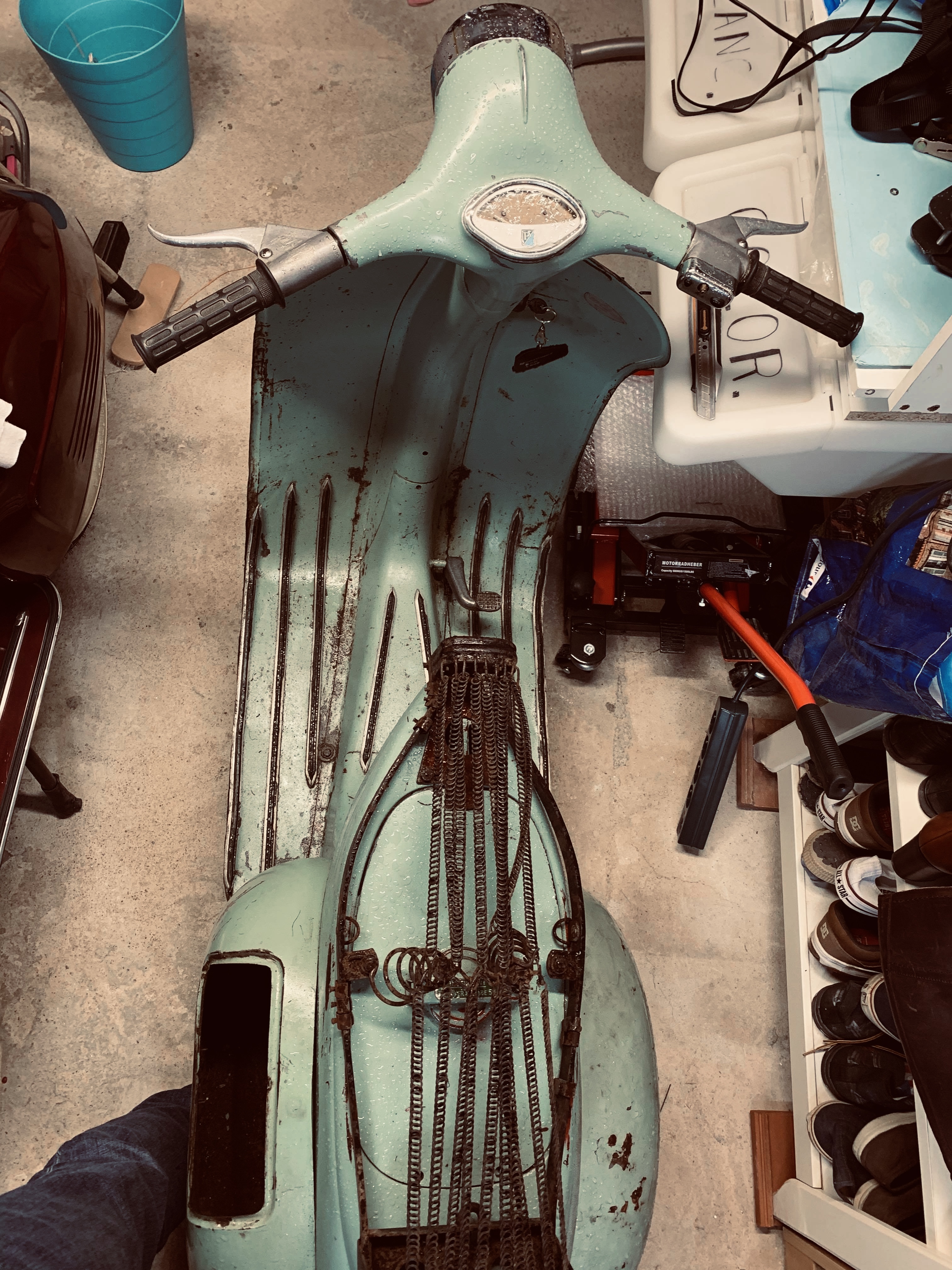 Salut, dans les 2 cas l'écusson est en alu. Riveté en 59, collé à partir de 60 (en observant bien le mien est collé de travers sur la gauche:mrgreen: scoot dans son jus). Tu pourras pas l'enlever sans l'abîmer, soit tu gardes le tien et peinture sinon une repro qui n'existe pas il me semble sans l'inscription piaggio, donc en partie à repeindre.