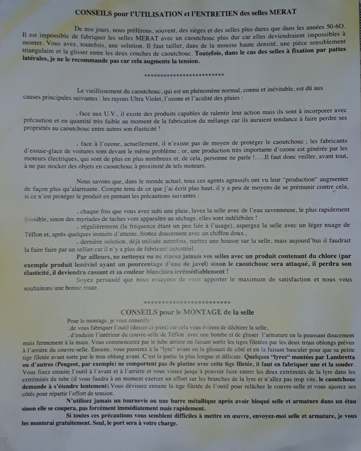 Re: SELLE MERAT : NOTICE DE MONTAGE + utilisation et entreti