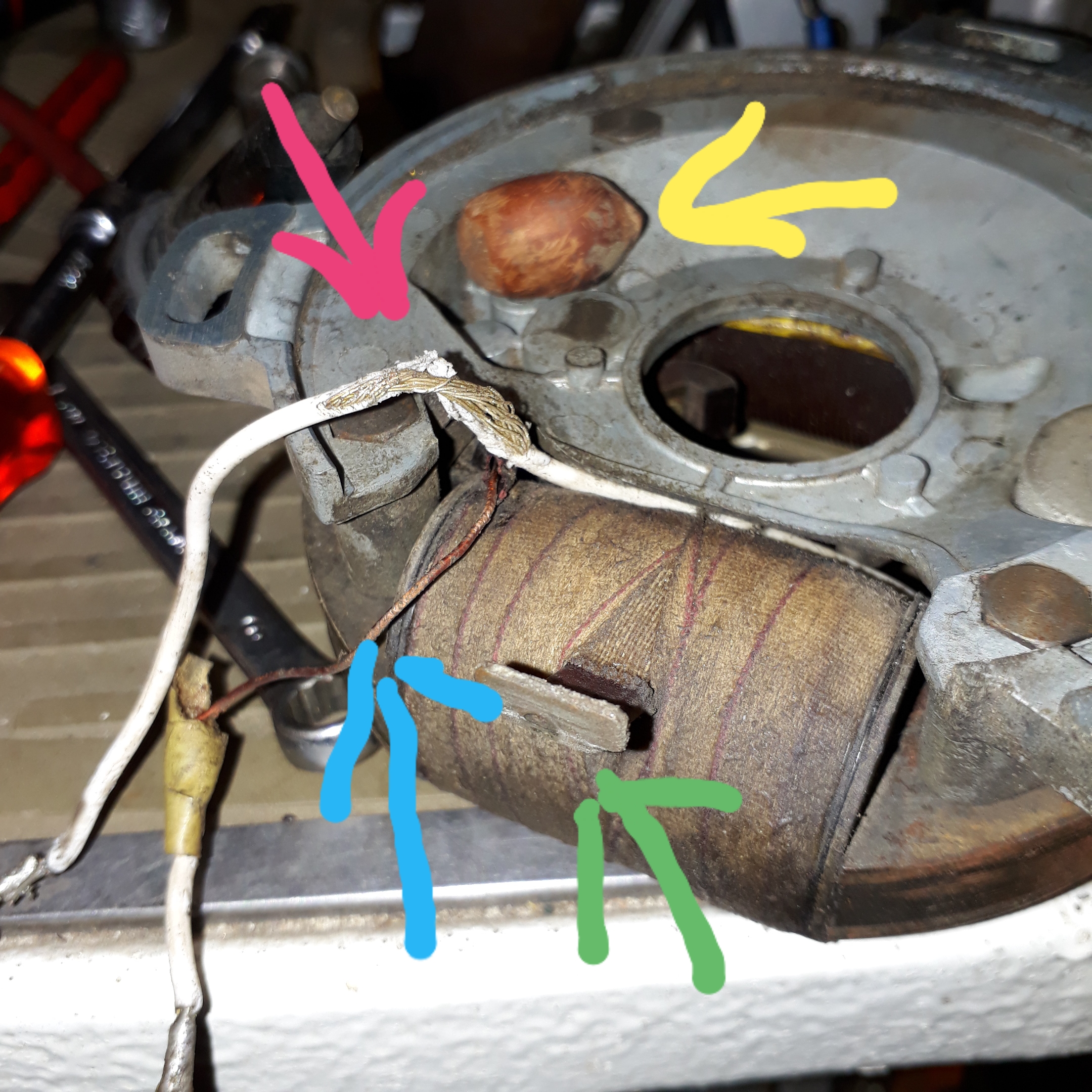 les dessous de la béte avec les traditionnelles glands et feuilles de chénes, mauvaise surprise au niveau de l'allumage la spécifique borne ht complétement hs pas grave j'avais en stock, je l'ai fait peter avec un carbu moderne et " vroum vroum.." il tourne mais de toute façon il sera ouvert.