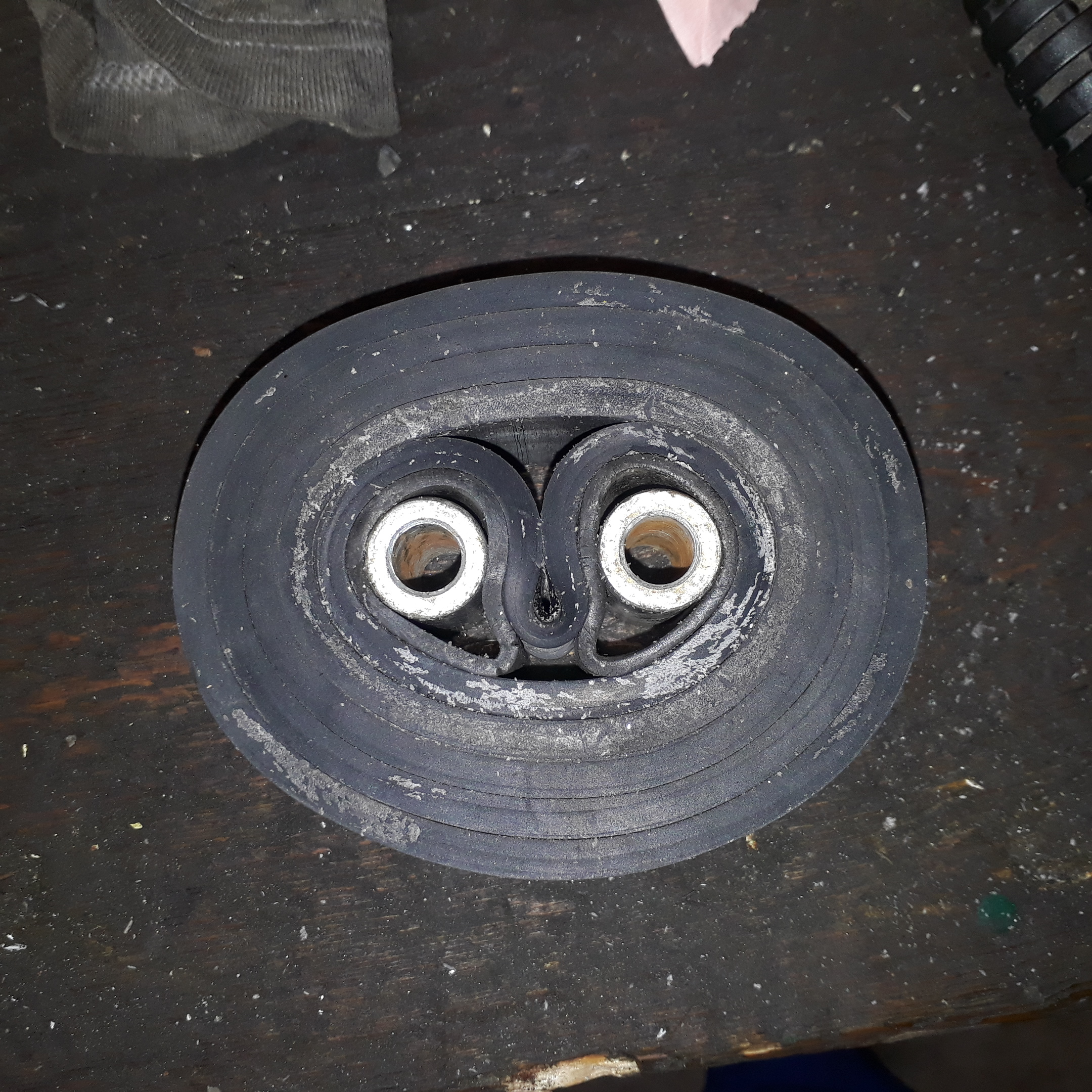 Voici ma version: Bloc de 5 anneaux de la marque TRAX/Trigano remorques; Fourreautage des axes avec des tubes (préconisés par mcdouve) en matière plastique dure, genre Teflon,usinés à dia.36, long.38,passage d'axe 10. Je ne conserve que 4 anneaux (5 çà ne passe pas avec les fourreaux épais), en mettant de côté le plus petit; l'essai sur route, à venir, confirmera mon choix , ou bien j'inverserai le + grand avec le +petit! A l'occasion, j'ai profité de ce démontage pour repeindre les éléments du bras de suspension et remplacer la vieille graisse et les joints spi de l'axe principal.