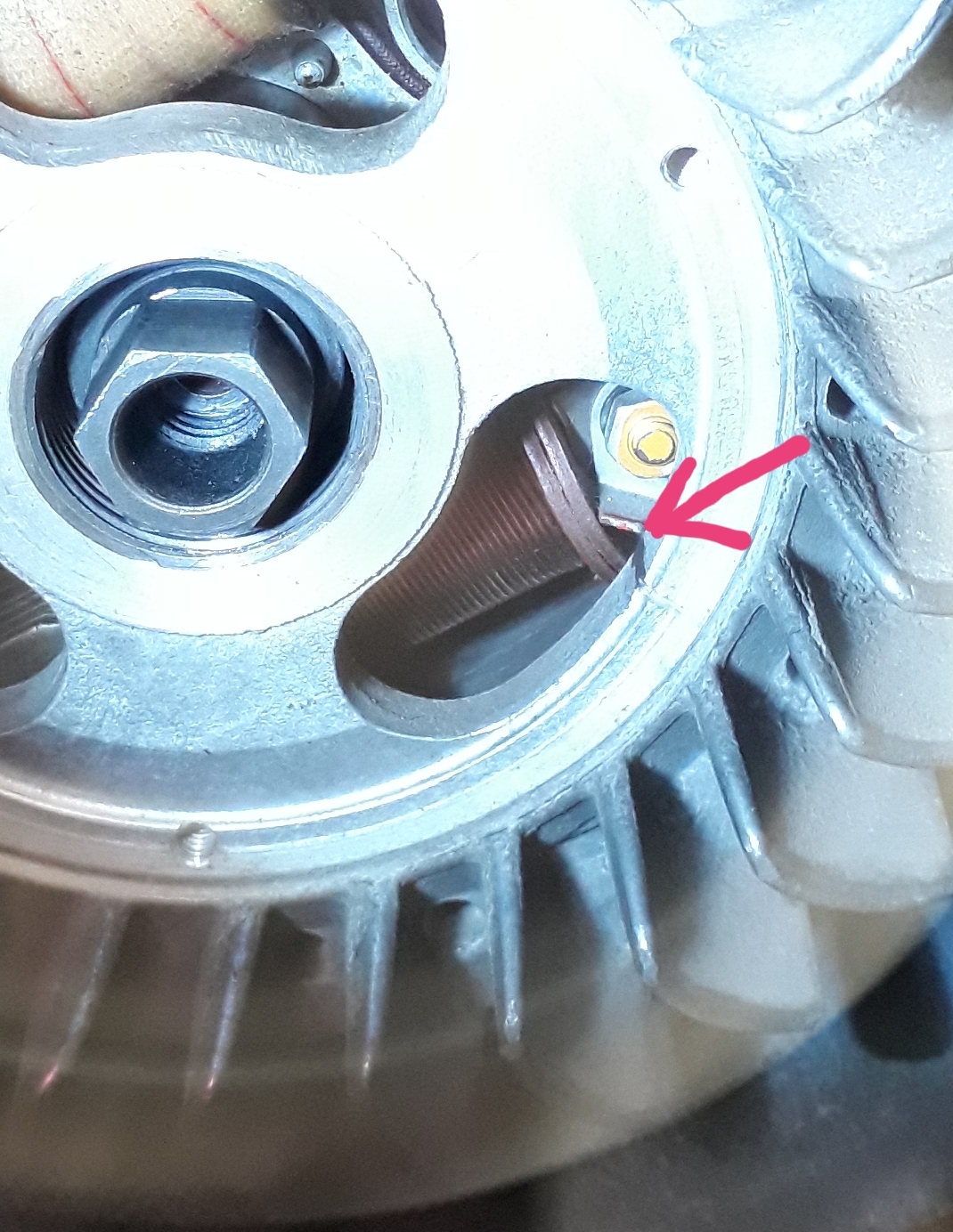 - j'ai marqué le PMH (Point Mort Haut) sur le volant moteur avec la méthode classique.