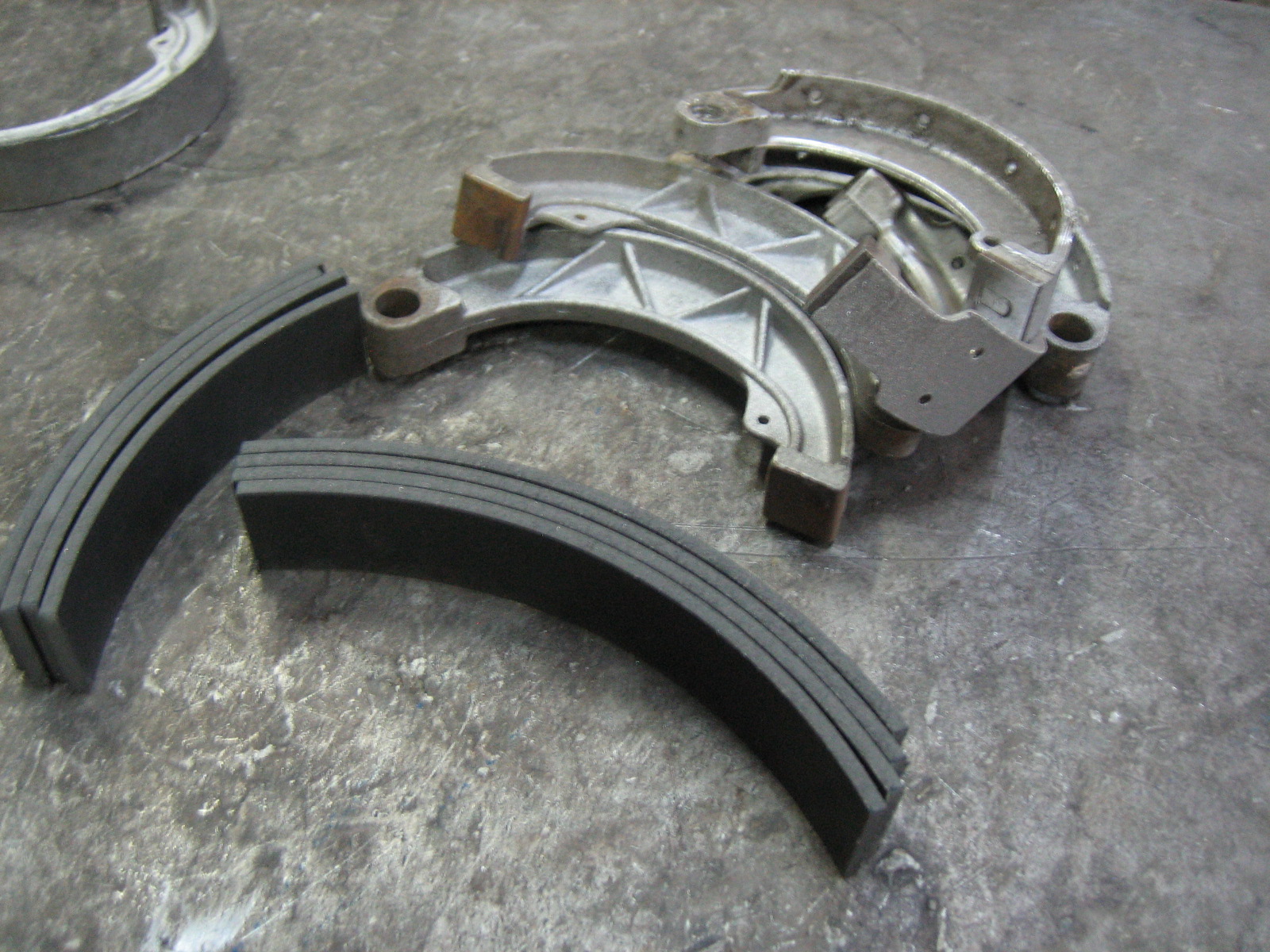 Deux types de machoires collé riveté Peugeot et juste collé Lambretta le tout d'époque. Le sablage. Les nouvelles garnitures. La mise en pression. Dix minutes de cuisson. Refroidissement. Ebavurage. Détalonage.