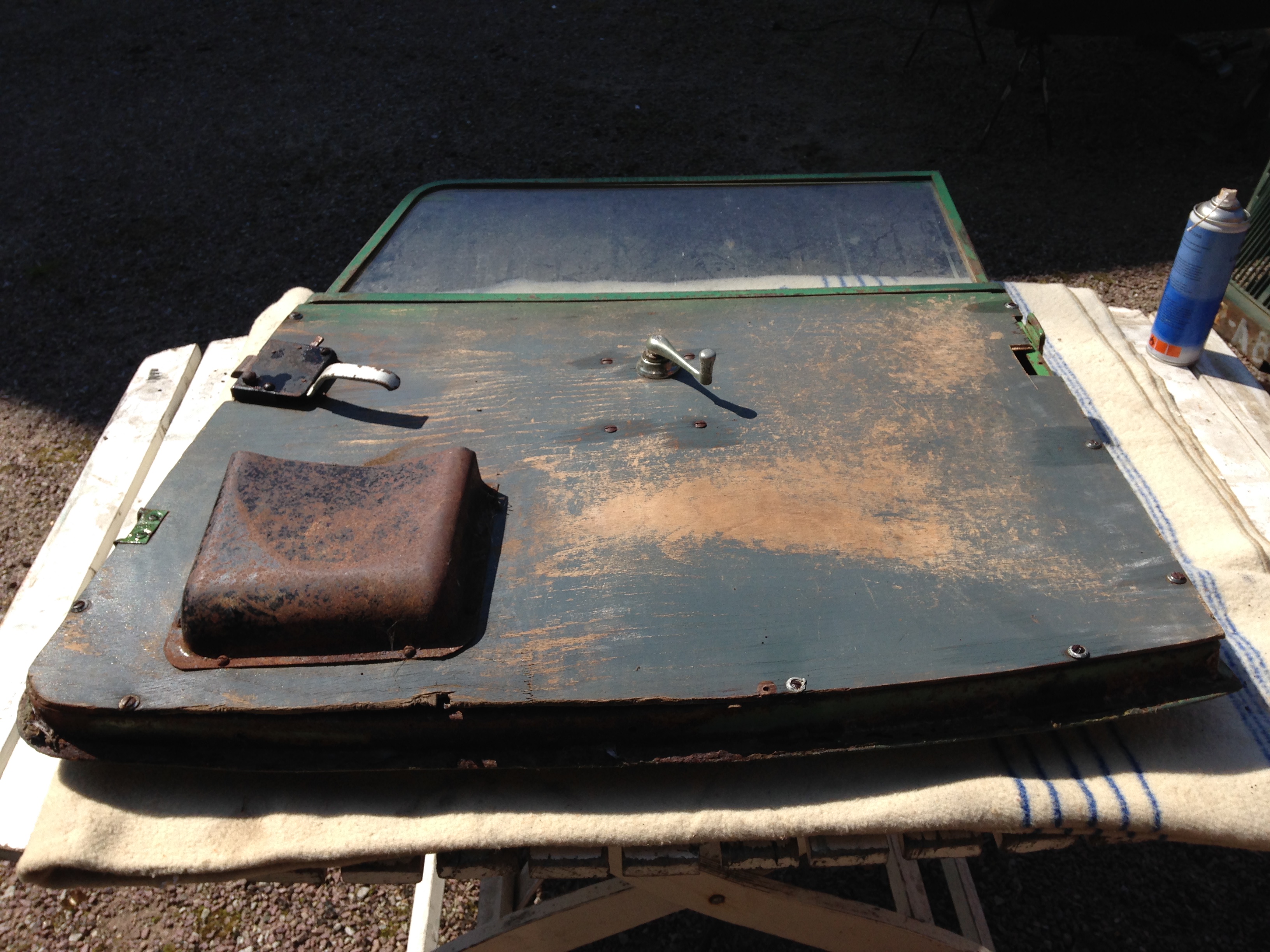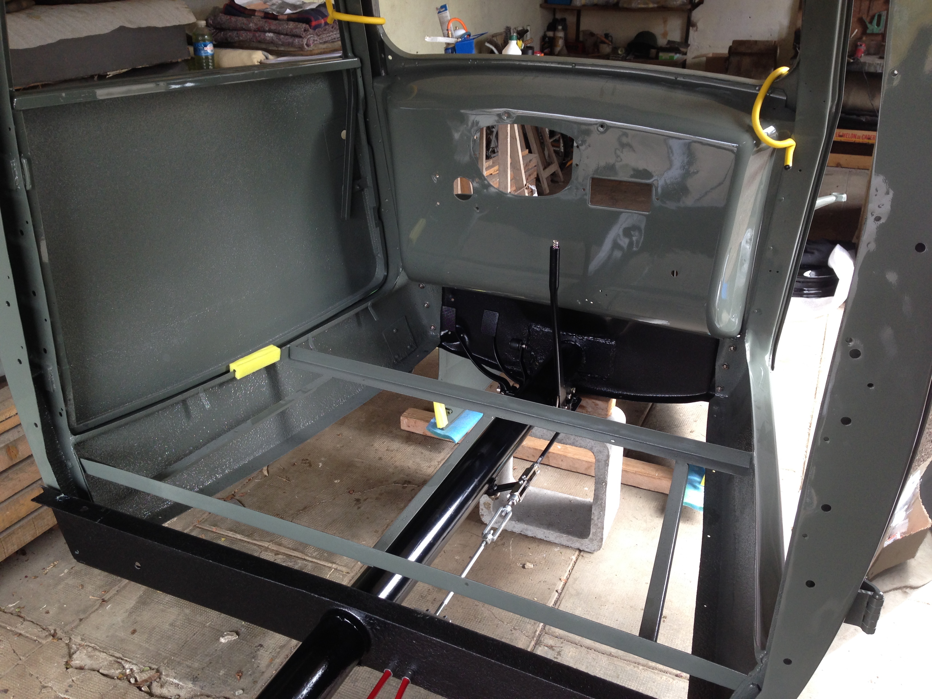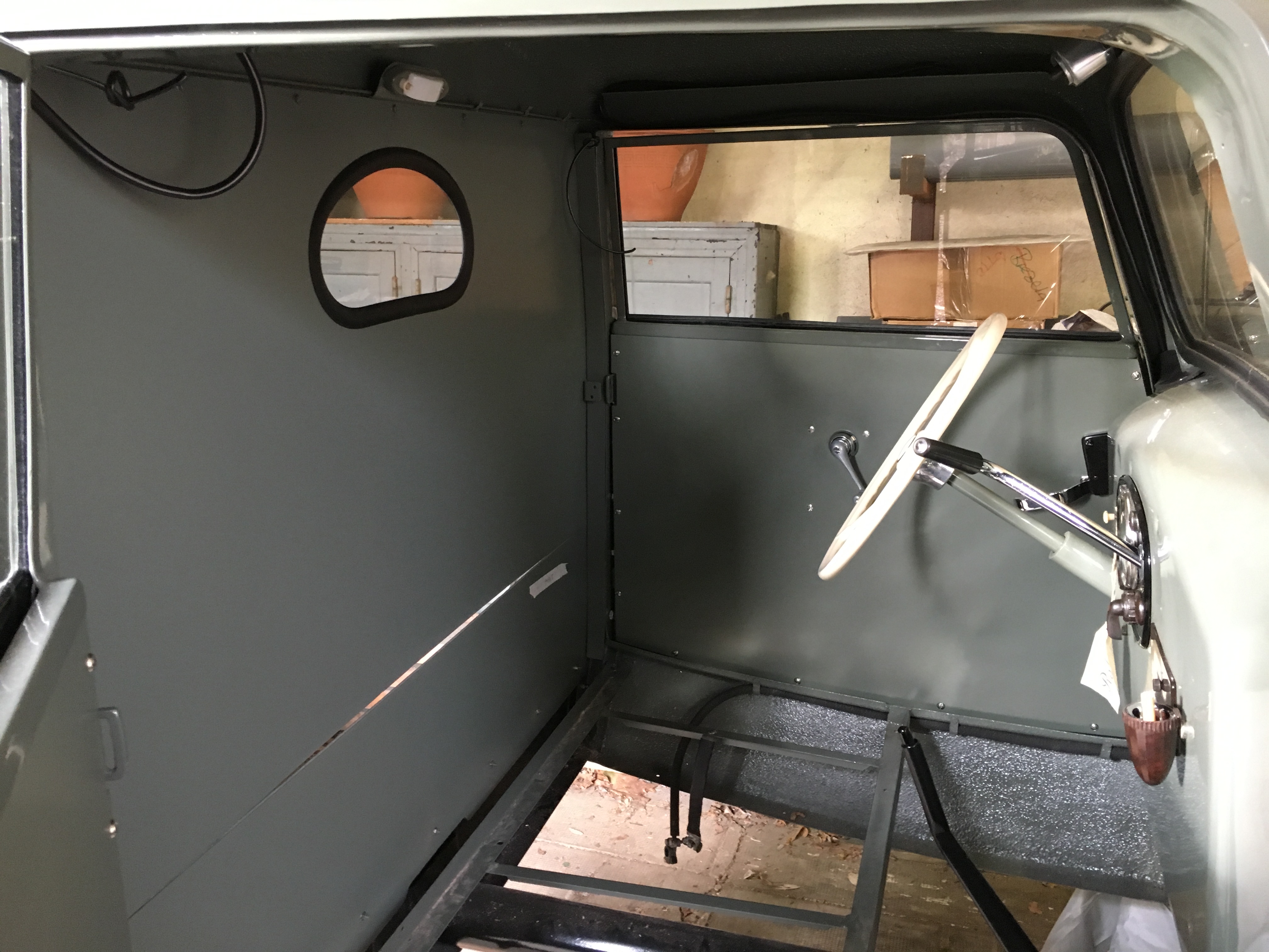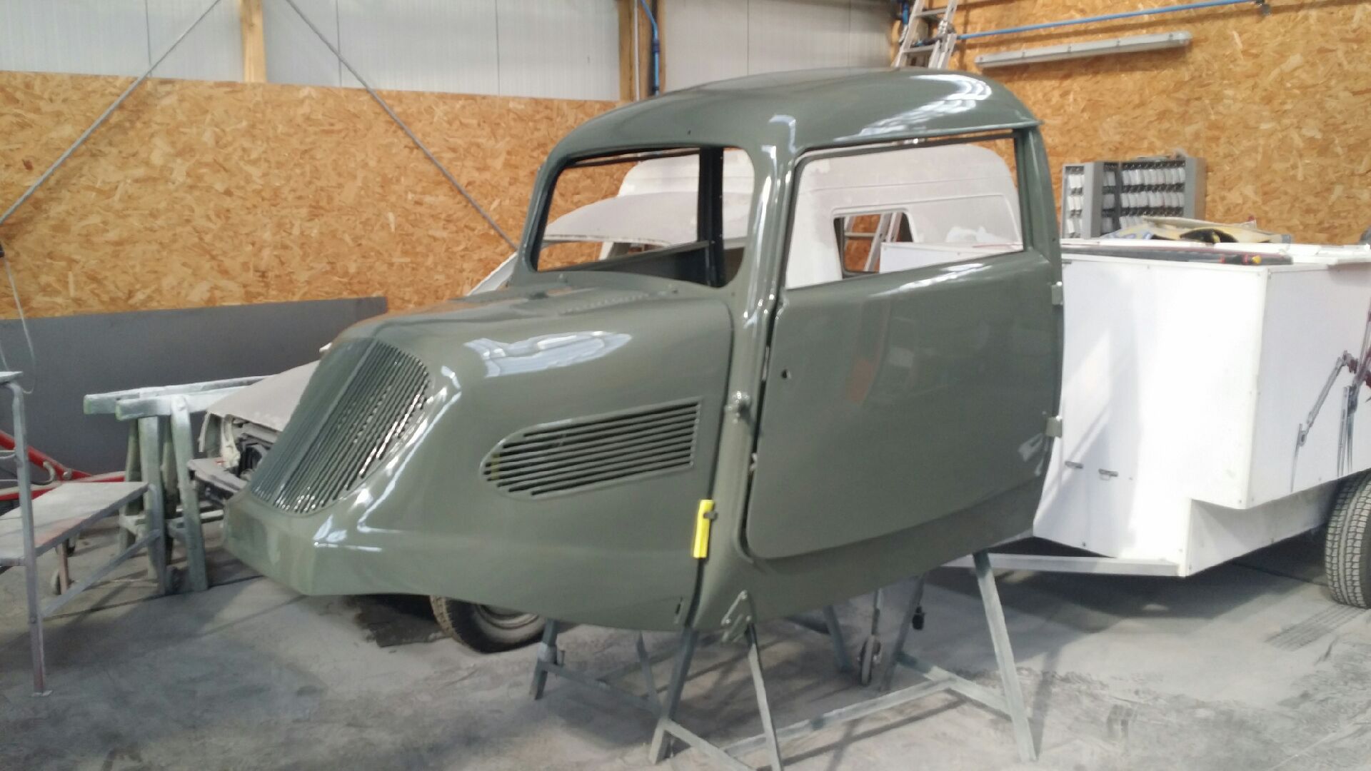 Refabrication de la lunette arrière mise en peinture du fond de cabine et des montants puis pose de l'ensemble sur le triporteur.