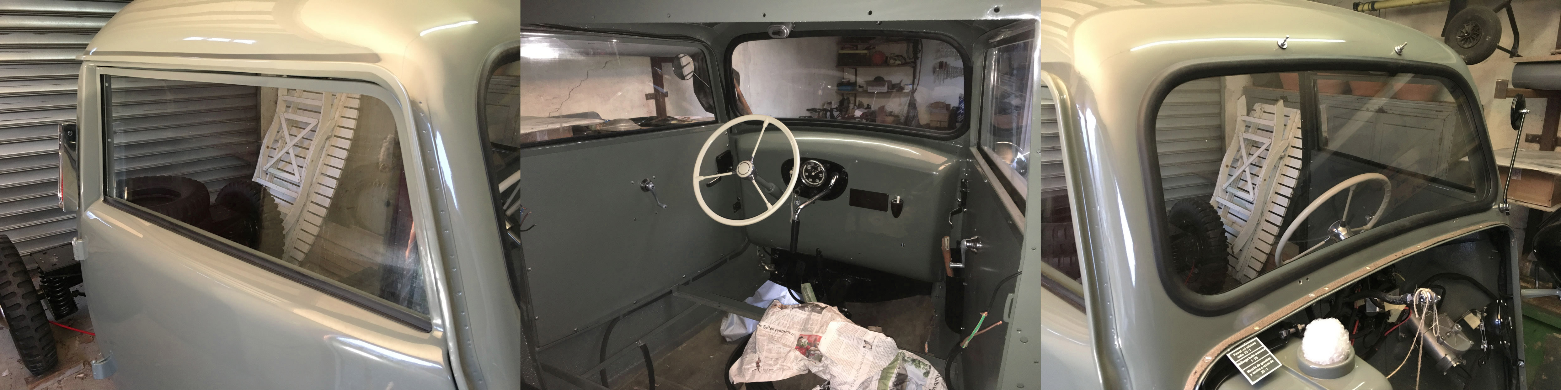 Refabrication de la lunette arrière mise en peinture du fond de cabine et des montants puis pose de l'ensemble sur le triporteur.
