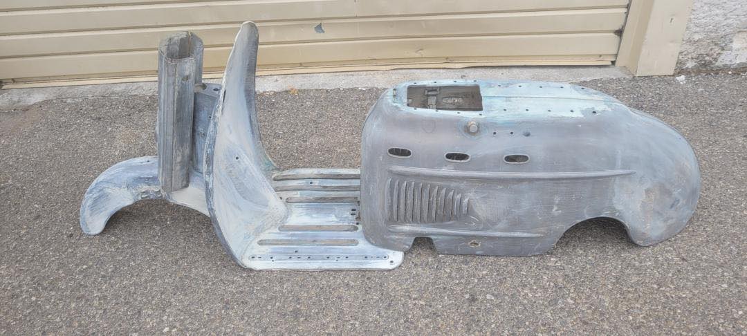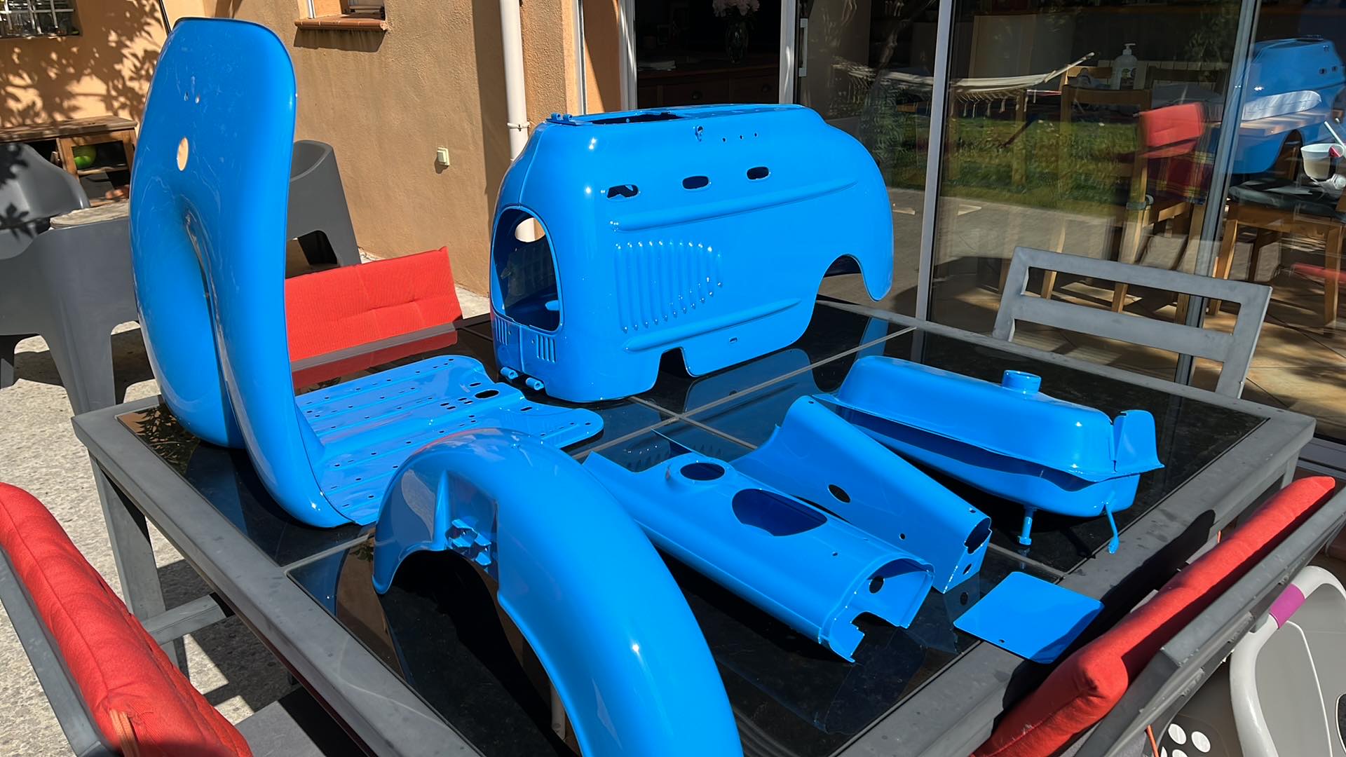 le scooter a été acheté au moi de mai 2021 et le chantier avance doucement ( et c'est un choix personnel ^^) , tout le cadre a été sablé et peint époxy. malheureusement je me suis trompé sur le choix de la couleur je vais donc refaire sabler le tout .... le moteur a été entièrement nettoyé ( microbillage , bain ) et est en cours de remontage . je joins une photo du bleu que j avais choisi et qui au final ne me plait pas .