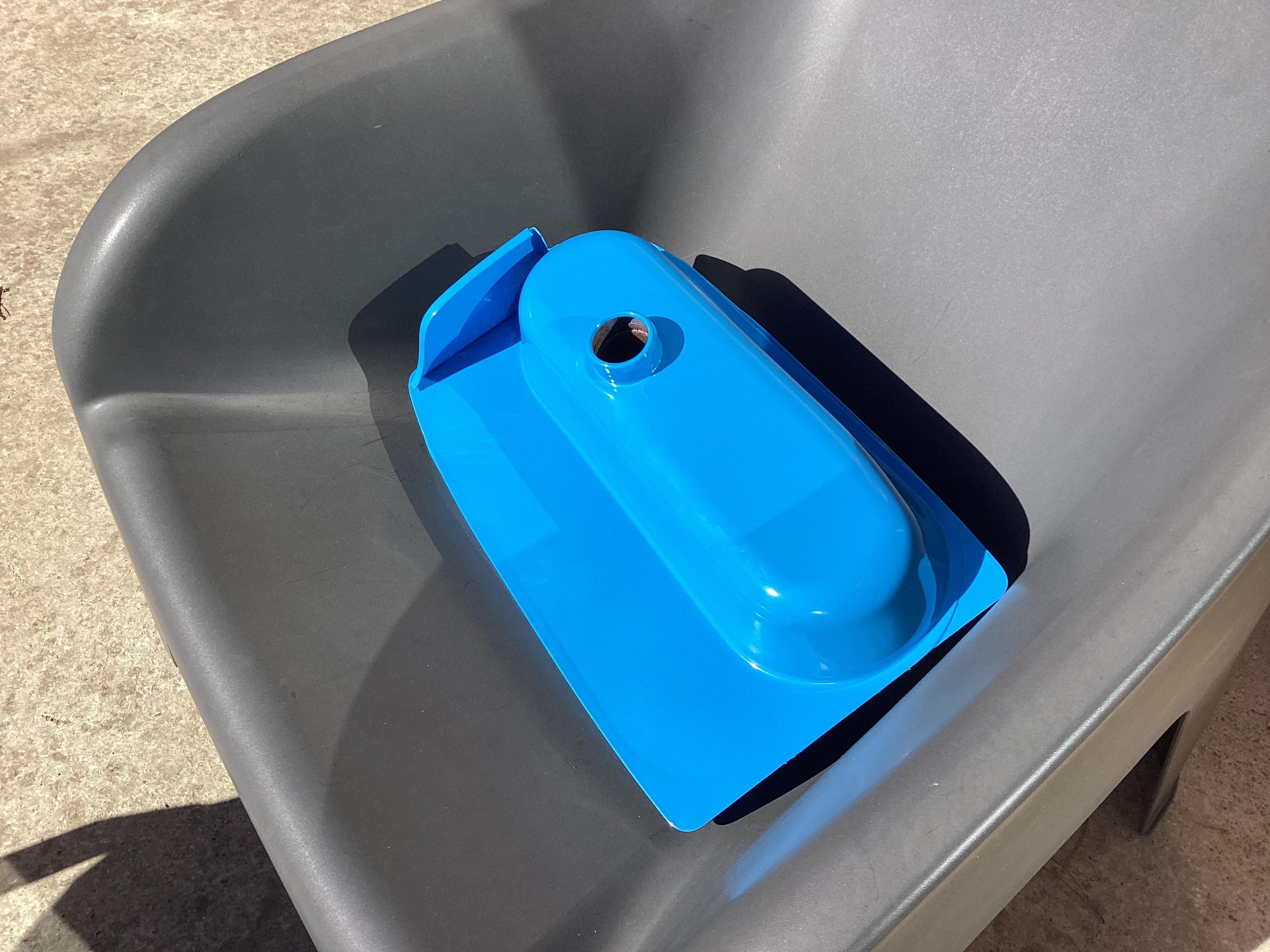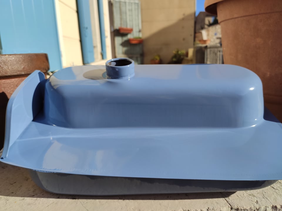 j'avais donc choisi le bleu pigeon , je suis a mon gout trop proche du bleu motobecane ... la gamme de couleur époxy n’étant pas très très large c'est pas simple je suis toujours hésitant sur un bleu pastel ( ral 5024 ) et un bleu clair ( ral 5012 ) je me suis donne jusque début d’année pour trancher pour ne pas renouveler mon erreur ...