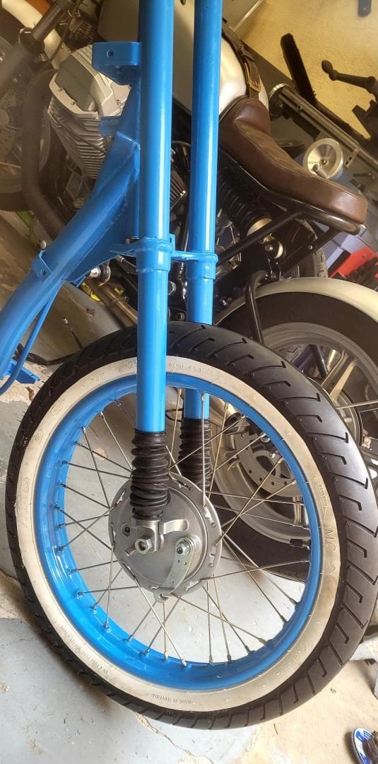 j'avais donc choisi le bleu pigeon , je suis a mon gout trop proche du bleu motobecane ... la gamme de couleur époxy n’étant pas très très large c'est pas simple je suis toujours hésitant sur un bleu pastel ( ral 5024 ) et un bleu clair ( ral 5012 ) je me suis donne jusque début d’année pour trancher pour ne pas renouveler mon erreur ...