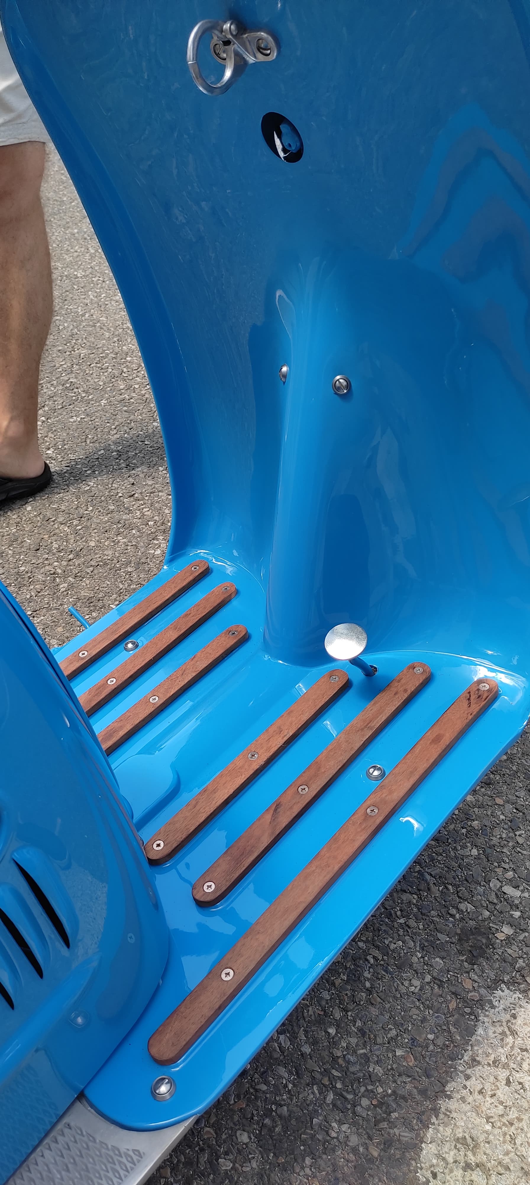 je suis a la recherche des chromes latéraux ainsi que les ouïes d’aérations latérales si jamais ;) , je vois aussi beaucoup de modèle avec sur la tablier les antidérapants chromés , les miens sont en bois ^^ ce sont des modèles qu'on peux récupérer chez vespa ou lambretta en neuf ou ce sera l'enfer a trouver ? tout comme le jonc de chrome le long du tablier ?