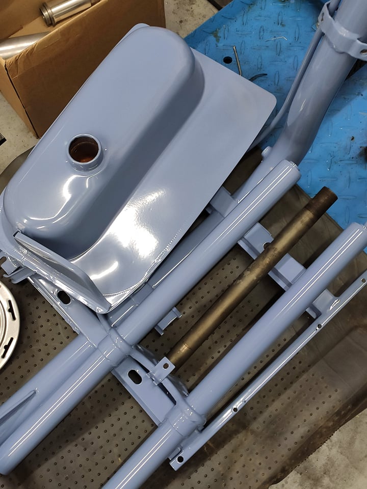 j'avais donc choisi le bleu pigeon , je suis a mon gout trop proche du bleu motobecane ... la gamme de couleur époxy n’étant pas très très large c'est pas simple je suis toujours hésitant sur un bleu pastel ( ral 5024 ) et un bleu clair ( ral 5012 ) je me suis donne jusque début d’année pour trancher pour ne pas renouveler mon erreur ...
