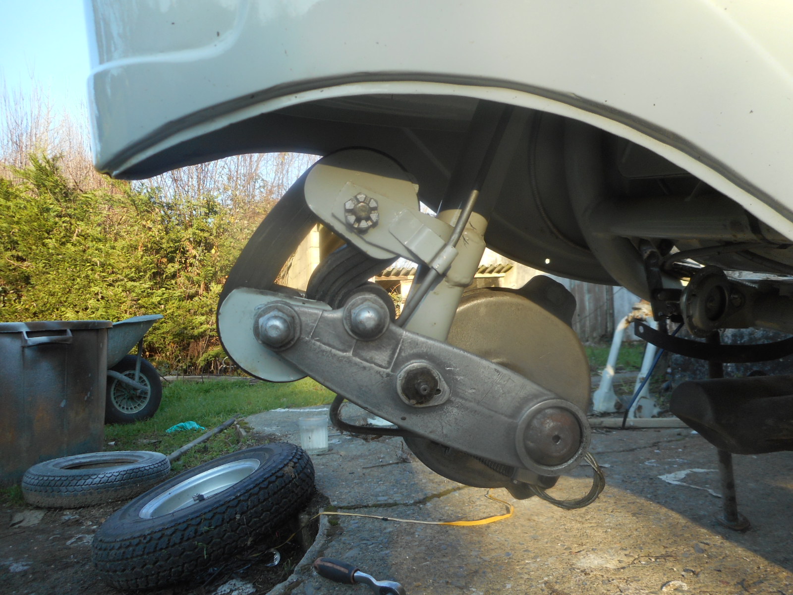 Voici ma version: Bloc de 5 anneaux de la marque TRAX/Trigano remorques; Fourreautage des axes avec des tubes (préconisés par mcdouve) en matière plastique dure, genre Teflon,usinés à dia.36, long.38,passage d'axe 10. Je ne conserve que 4 anneaux (5 çà ne passe pas avec les fourreaux épais), en mettant de côté le plus petit; l'essai sur route, à venir, confirmera mon choix , ou bien j'inverserai le + grand avec le +petit! A l'occasion, j'ai profité de ce démontage pour repeindre les éléments du bras de suspension et remplacer la vieille graisse et les joints spi de l'axe principal.