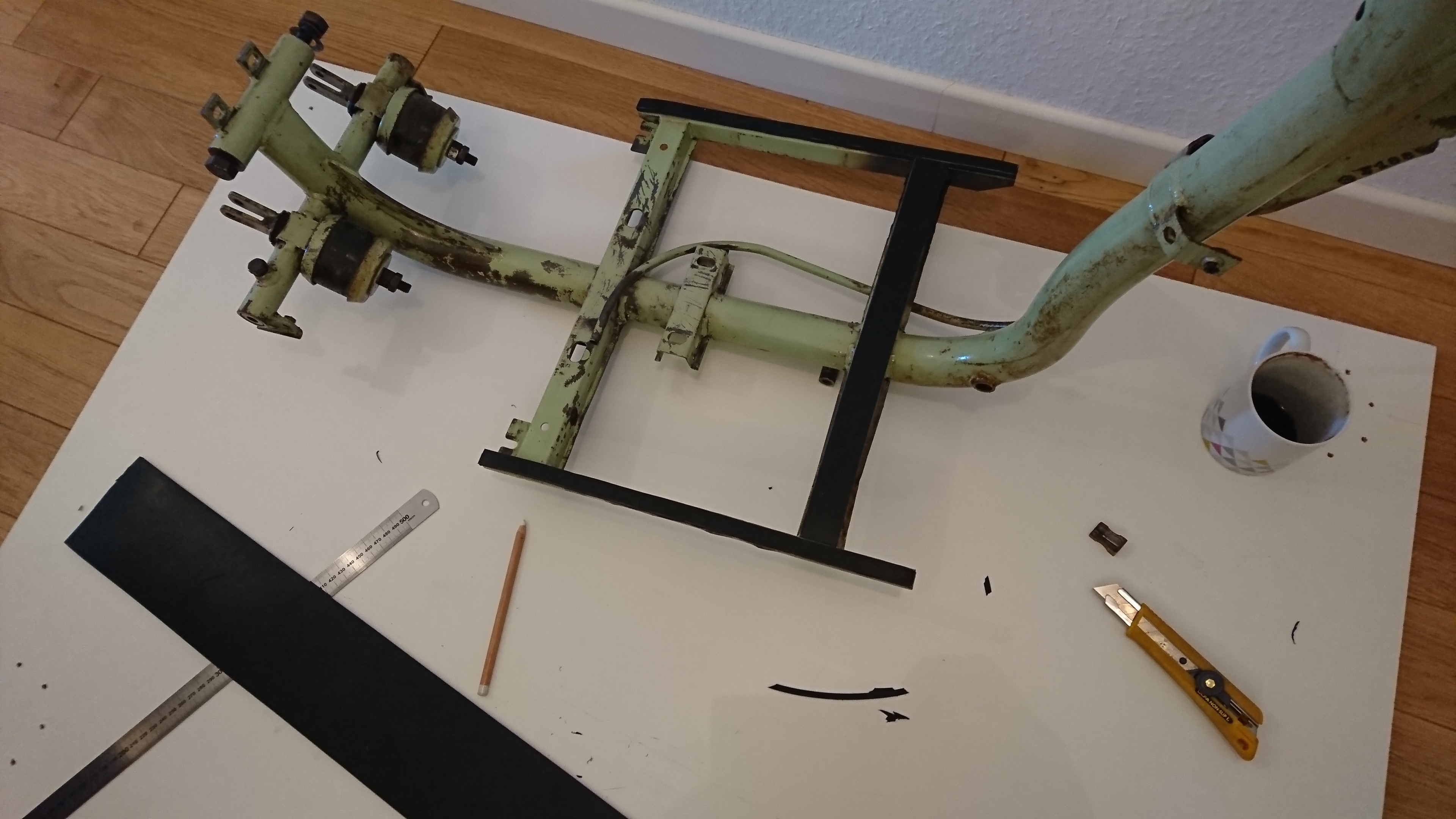 Je suis en train de finaliser l'éclairage, que j'ai mis sur batterie (12,6v 14Ah, dans une boîte fixée sous le porte-bagage), reste à trouver un compteur. J'ai quelques envies pour le rendre un peu plus "post-apo", mais c'est du bonus: il roule bien et c'est l'essentiel (quoi que... ^^)