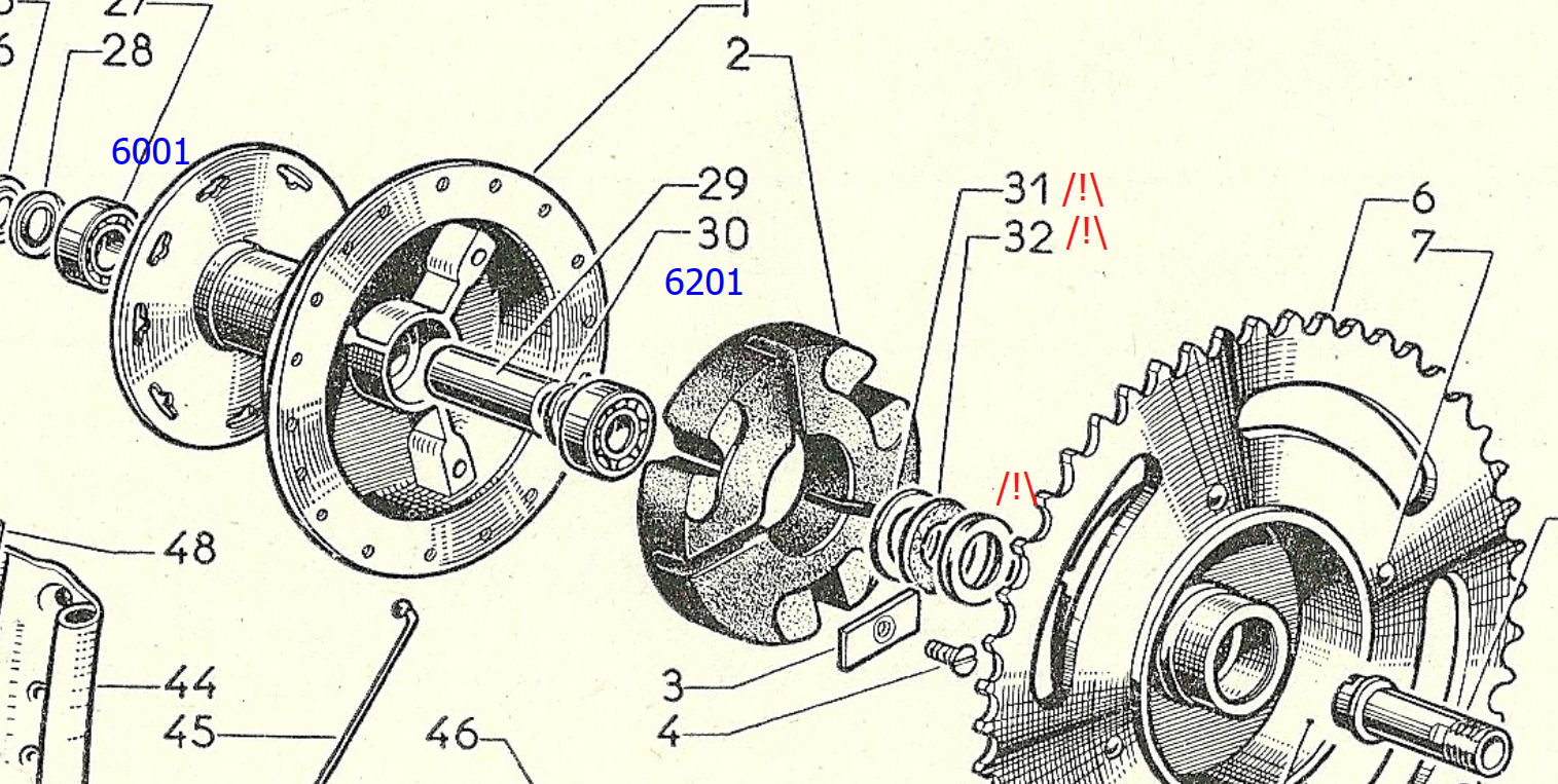 Arrière: roulement 6001 (27) + roulement 6201 (marquage absent sur les planches d'éclaté) + 16003 (16) dans la couronne/tambour
