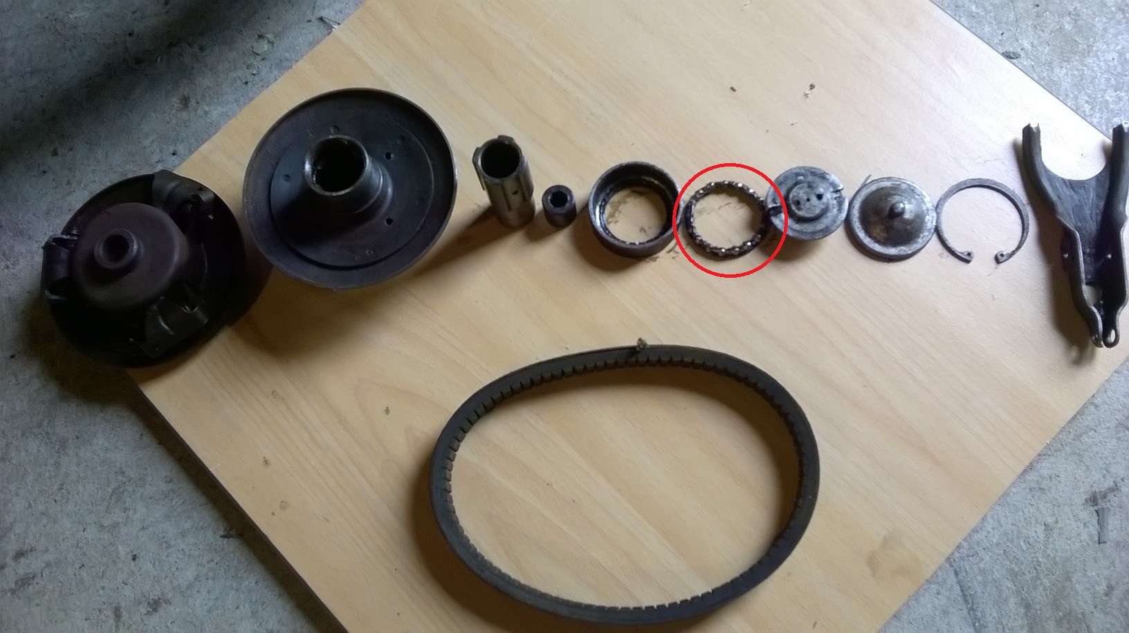J'ai essayé de démonter le cône (qui a un petit têton) après le circlip au niveau de la poulie primaire, impossible. J'avais déjà galéré la dernière fois mais là c'est pire. Je me souviens qu'au remontage il y a quelques mois j'avais du "pousser" le cône dans son logement avec des coups de maillet en caoutchouc, il est bien rentré désormais et ne veut plus quitter son logement :lol: Chose étonnante, les grincements ont disparu, pourtant je n'ai rien fait au niveau de "l'entre les flasques".