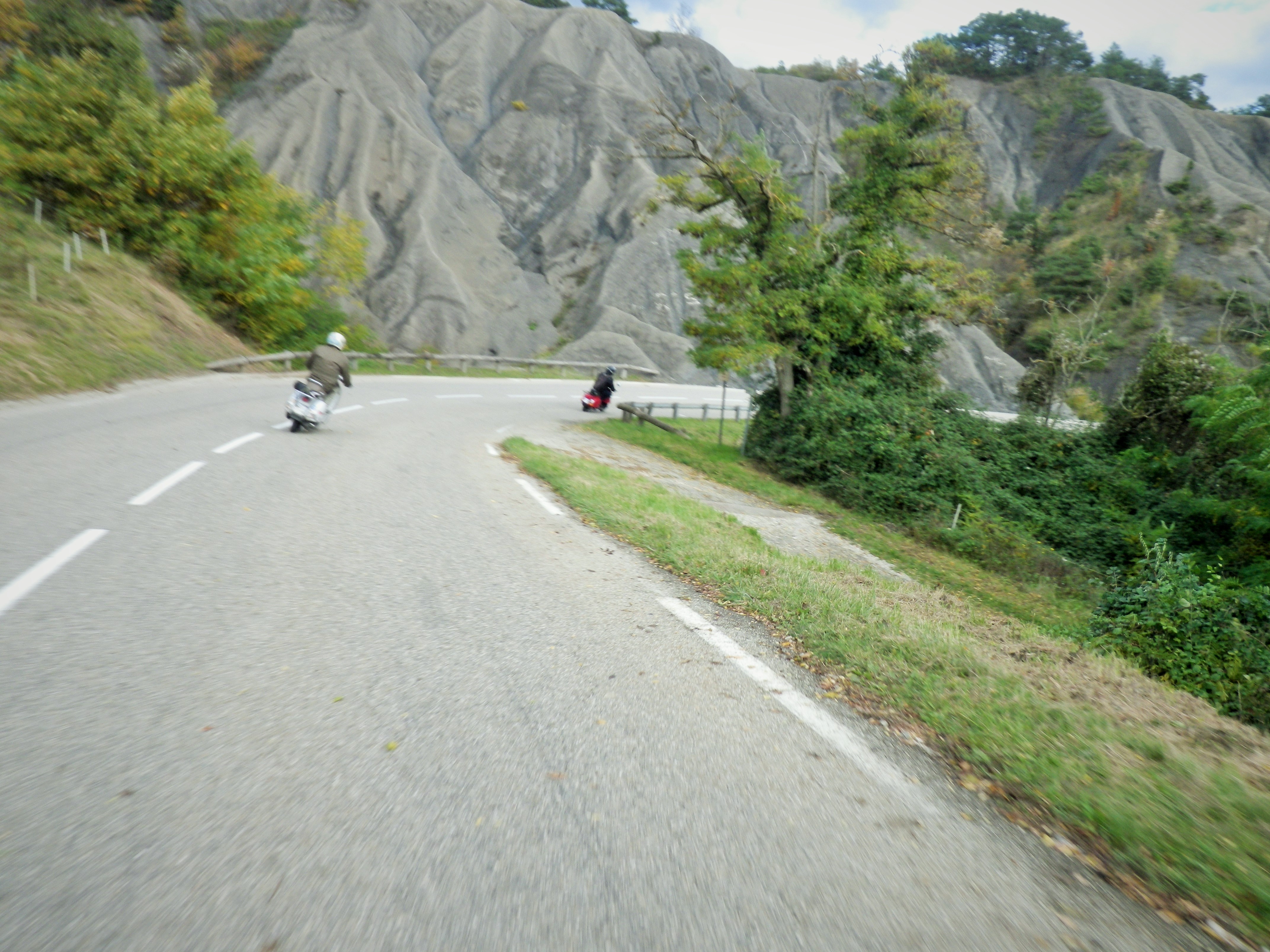 Et à 14h30, nous étions sur les scoots. Près de 3 heures de balade, roulage, sur des routes parfois sèches, parfois humide, mais toujours végétales (c'est l'automne, les feuilles mortes tapissent le bitume).