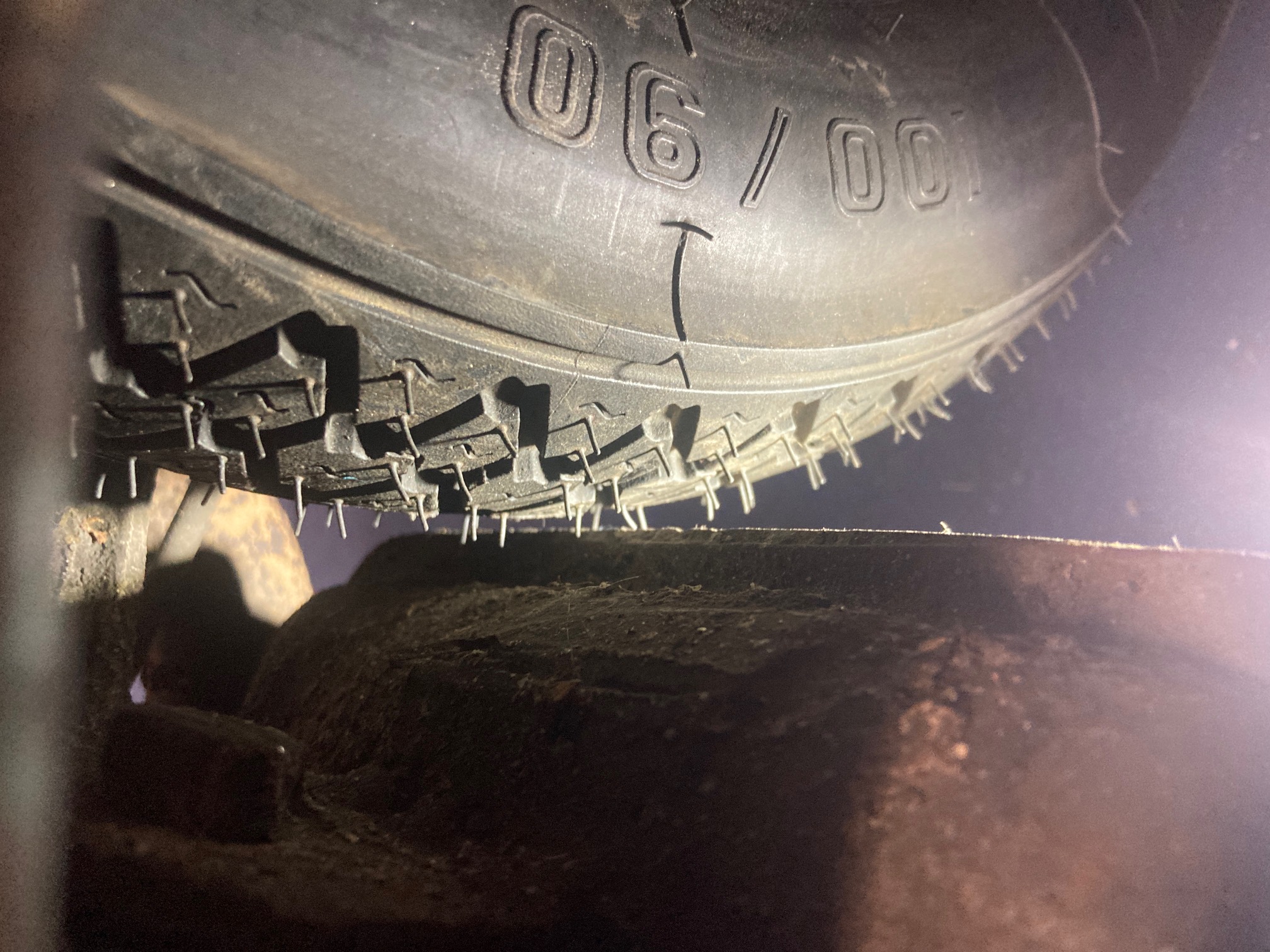 Photo 1 : On voit 2 x 4 rangées de sculptures sur chaque S83. Le 100/90-10 est le pneu avec la marque blanche.
