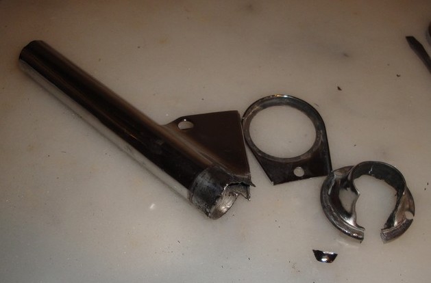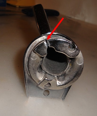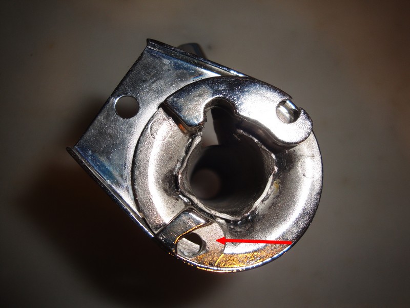 avec une "comme une dremel" j'ai tronçonné là: en écartant les 2 côtés avec un tourne vis costaud ne reste qu'à aplatir les 3 ergots de la poignée, enfiler la platine et la nouvelle cocotte, refaire les 3 ergots et mettre un coup de soudure (prochaine étape)