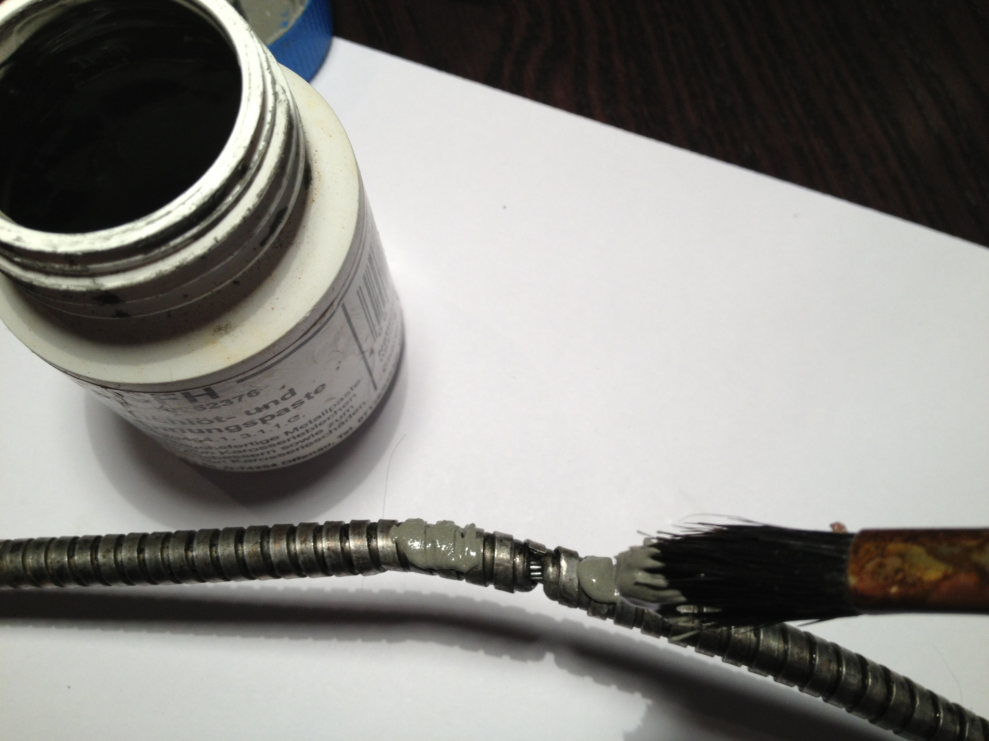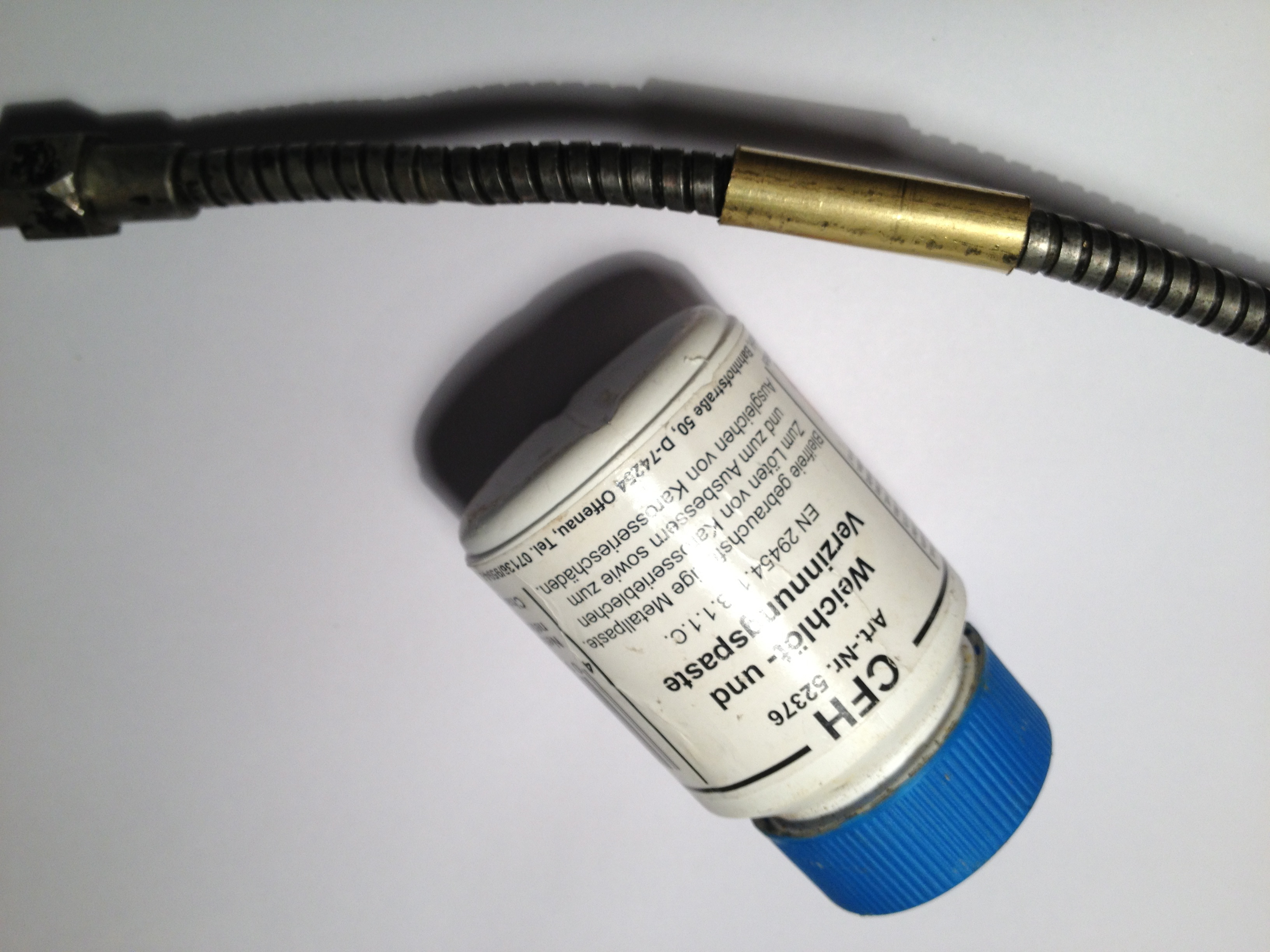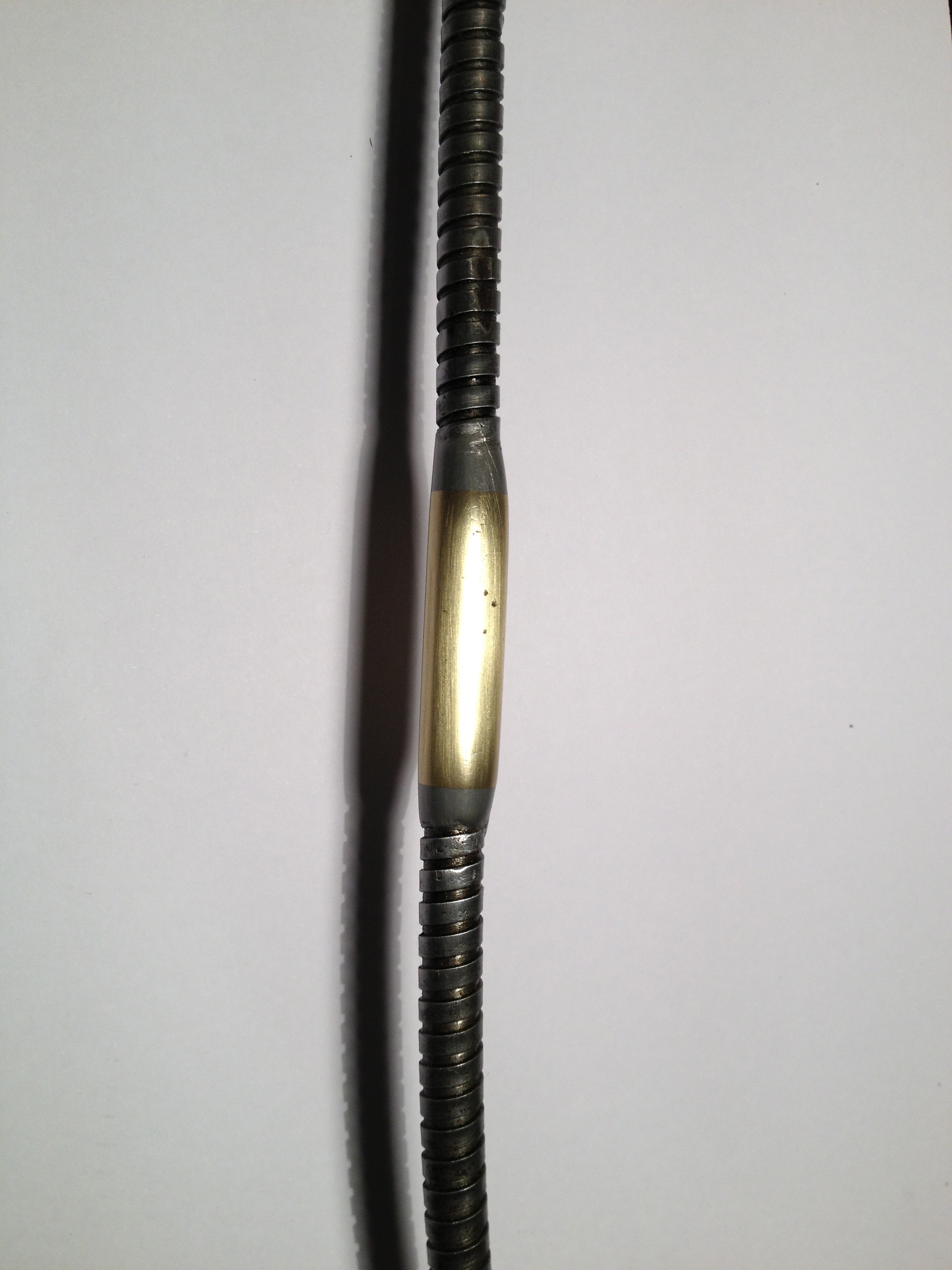 1. Préparer le tube fendu. 2. Etaler la pâte à étamer sur les deux extrémités de la gaine de frein 3. Positionner le tube au milieu de la cassure, chauffer avec un chalumeau de brasage pour souder l'ensemble et terminer avec le fil d'étain pour refermer les extrémités du tube ainsi que la fente réalisée au point 1. 4. Poncer la brasure. 5. Couper la bonne longueur de gaine thermo-rétractable. 6. Enfiler la gaine de frein dans la gaine thermo-retractable et chauffer l'ensemble à l'aide d'un séchoir thermique afin de rétracter la matière en Polyoléfine, élastomère. 7. Replacer un graisseur neuf, pas celui-ci mais plutôt un graisseur 6 pans plat en laiton. Et voilà c'est tout neuf.
