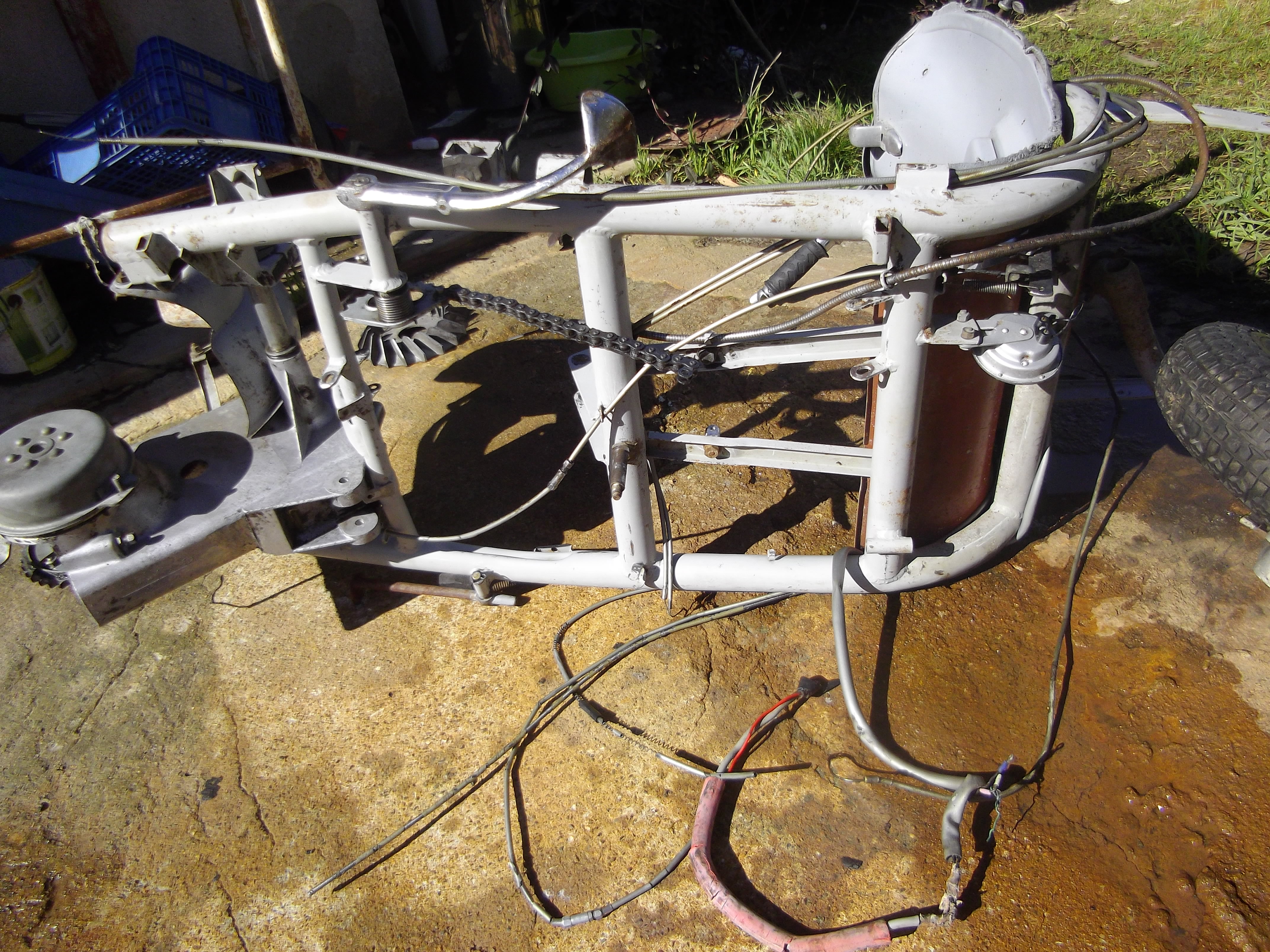 salut, bon le scoot de notre ami riton le basque est entré en clinique pour une réfection partielle ( sauf carrosserie) aprés avoir sorti le moteur du cadre s'en est suivi une séance de nettoyage sur une grosse matinée a gratter toute cette masse de boue+graisse cokéifiée c'est long et c'est pas le boulot le plus gratifiant mais faut le faire, deuxiéme opération s'attaquer aux fameuse suspensions par anneaux qui comme d'hab étaient éclatées donc la aussi nettoyage+dérouillage+un coup de peinture histoire de faire plus propre+évidemment des anneaux neufs j'ai meme fait tourner des bagues en téflon pour mettre les anneaux en tension immédiates les axes d'origines étant ridiculement faibles en diamétre la aussi une grosse journée de boulot mais le résultat est la une machine qui se dresse sur ses 400x8 tout neufs avec un balancier avant qui pointe vers le ciel et le carter arriére aussi signe d'une suspension au top, la suite consiste a changer tout le réseau gainerie cablerie qui est naze bien évidemment le moteur a été ouvert et j'attends les roulements et joints spi pour tout refermer mais c'est une autre histoire