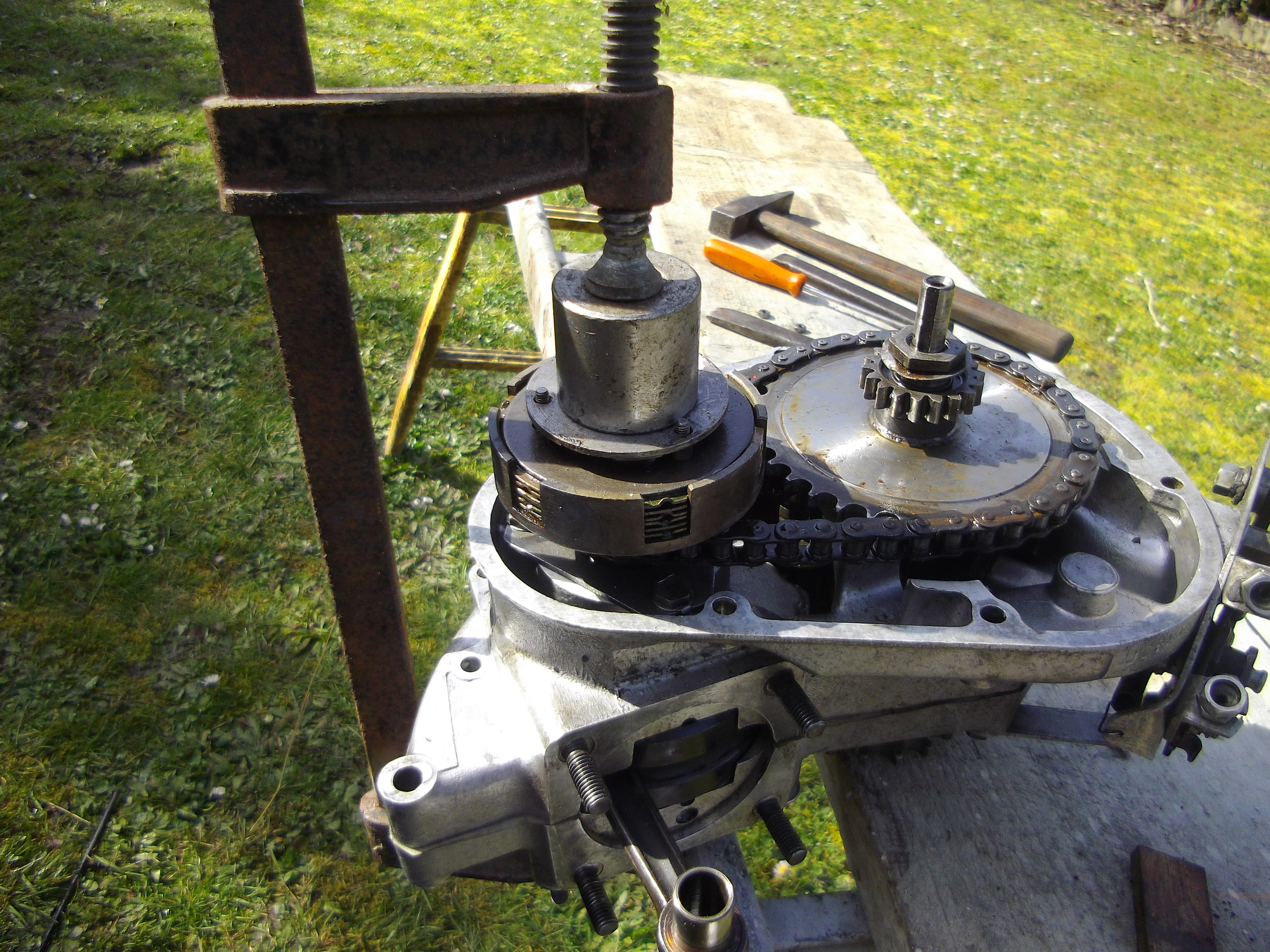 salut suite du feuilleton avec le fermeture du moteur avec ses roulements et ses joints spi neufs dans un premier temps fermeture du carter pompe avec la boite et le vilo et dans un deuxiéme temps la transmission+ embrayage+le cliquet du kick avec un compresseur d'embrayage maison sinon impossible a remonter