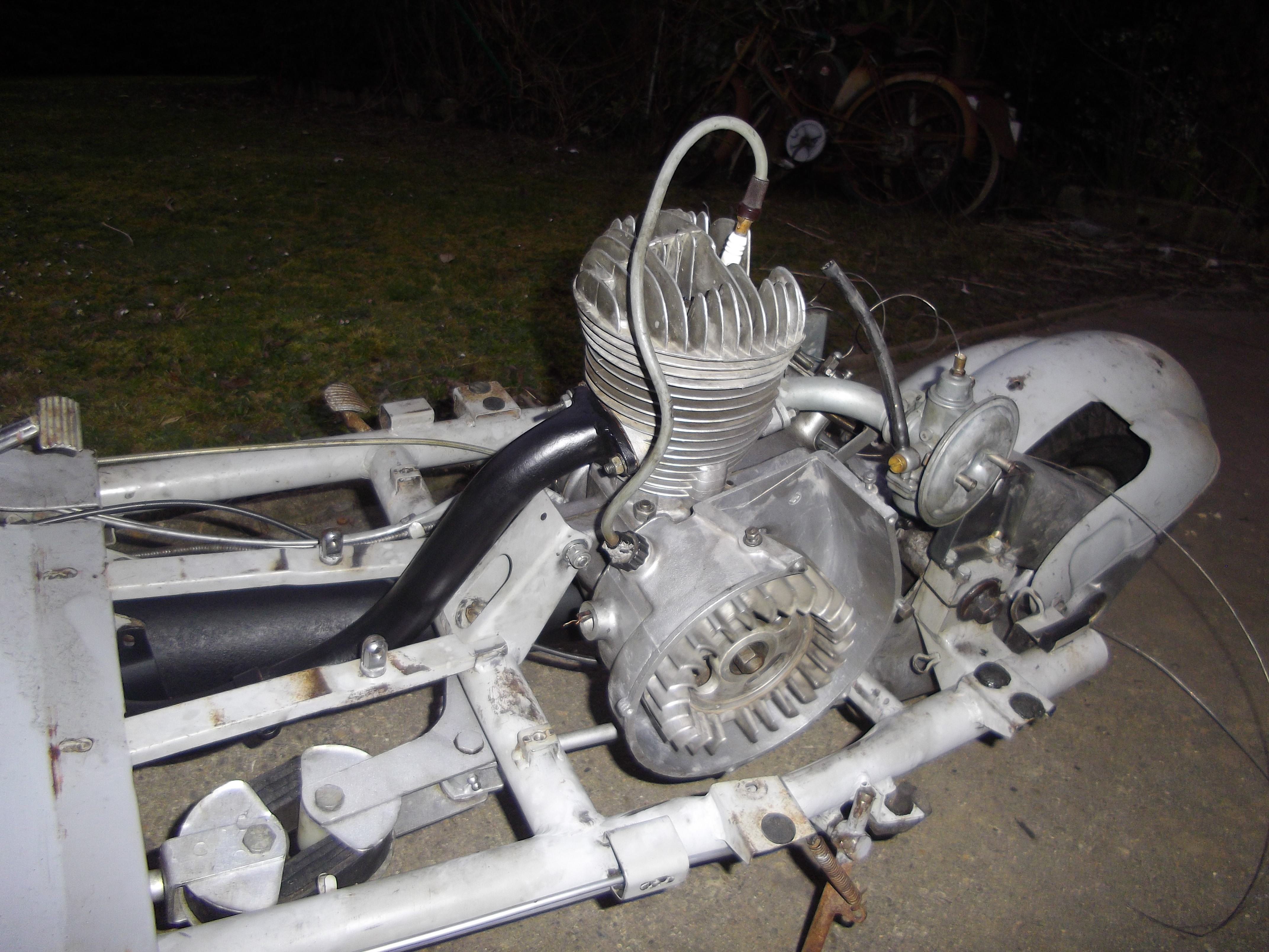 c'est pas fini avec remise du moteur dans le cadre, remontage du haut moteur le cylindre étant chromé dur donc pas touche, nettoyage en régle du piston et de la culasse+ deux segments neufs, pose du plateau d'allumage reconditionné rupteur condo neuf, isolation du réseau fil avec de la gaine thermo, la bobine ht est comme neuve ( c'est la 2 points jaunes les meilleures) donc on garde, réglage rupteur résultat une belle étincelle bien bleue comme on les aime, 30cl d'huile de boite 80w90, raccordemment du pot et la le grand moment est arrivé la bete a rugi au bout de quelques coups de kick énergiques vu la grosse compression du moteur, ralenti impec prise de tour immédiate pas de bruits suspects enfin que du bonheur.