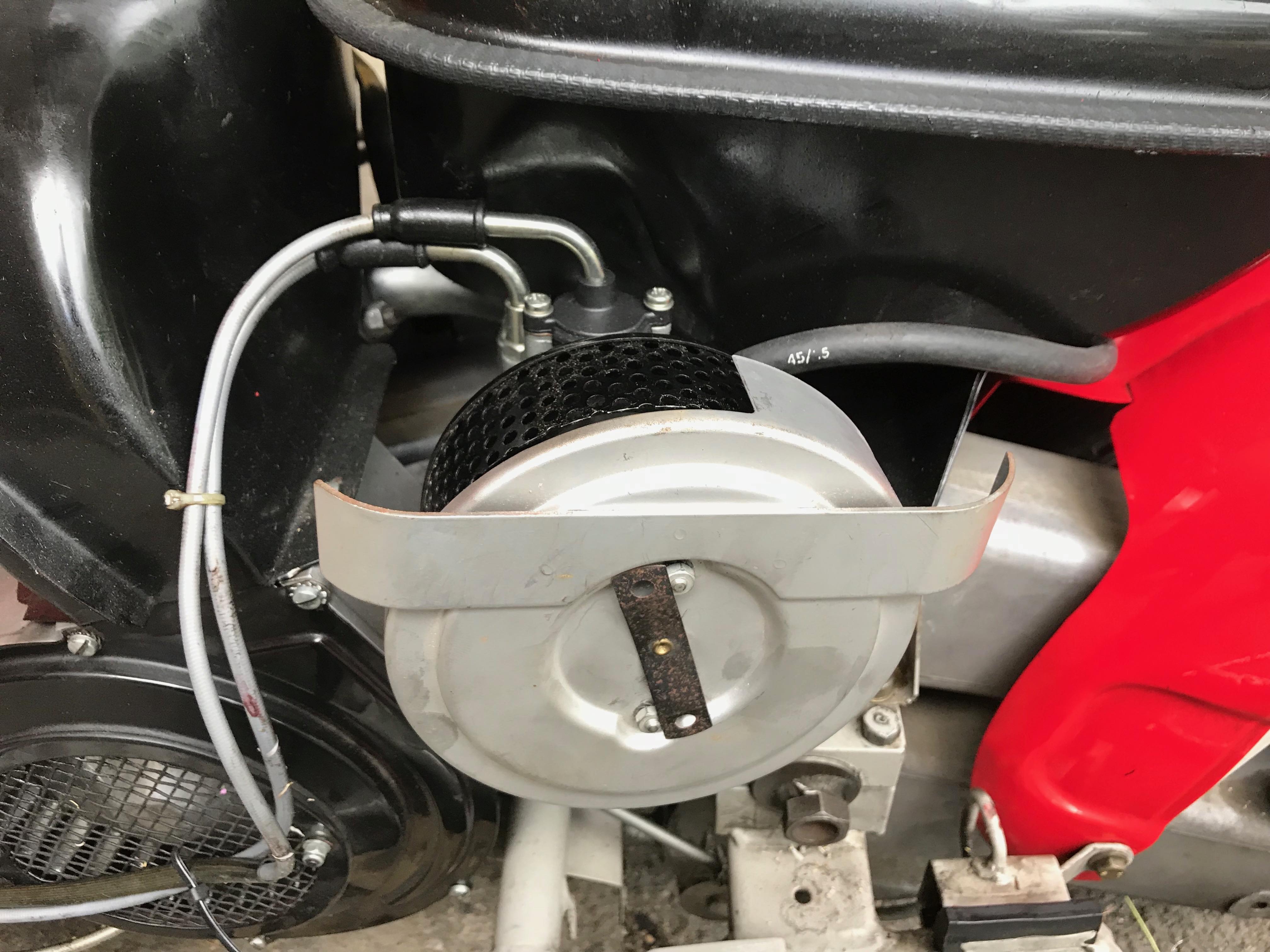 salut, pourquoi ne pas essayer un gicleur de 87? le gicleur de 85 est-il un gicleur dellorto ou une repro qui a valeur exacte n'a pas le meme calibrage après le fait de mettre un filtre a air va peut etre ( je dis bien peut-être) modifier ta carburation car le flux d'air va etre différent et la quantité d'air risque d'etre différente de par le filtre en lui meme et le fait qu'il va passer très pres de la coque d'ailleur au passage as tu vérifié que tu puisses bien fermer le capot perso je ne mets pas filtre enfin les essais nous en diront plus.